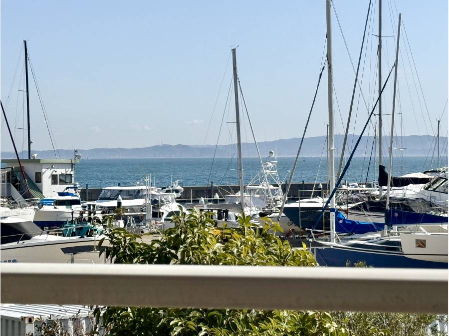 窓を開けると、ヨットハーバーと海が輝く美しい景色が広がります。