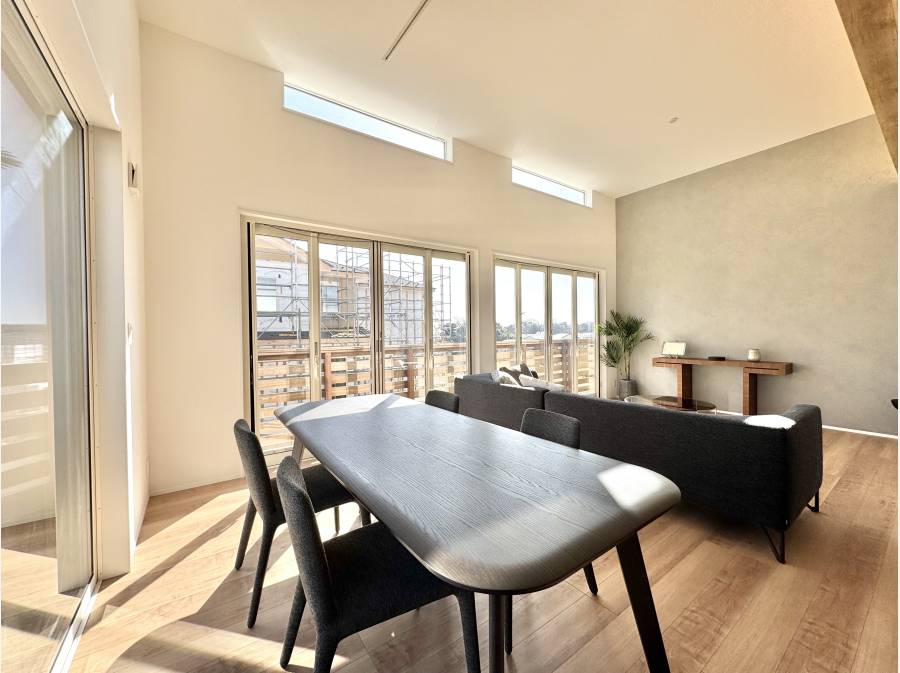 建物はワンフロアで完結するゆったりとした平屋設計。南東向きの配置と角地ならではの抜け感により、室内には一日を通してやわらかな陽光が差し込みます。