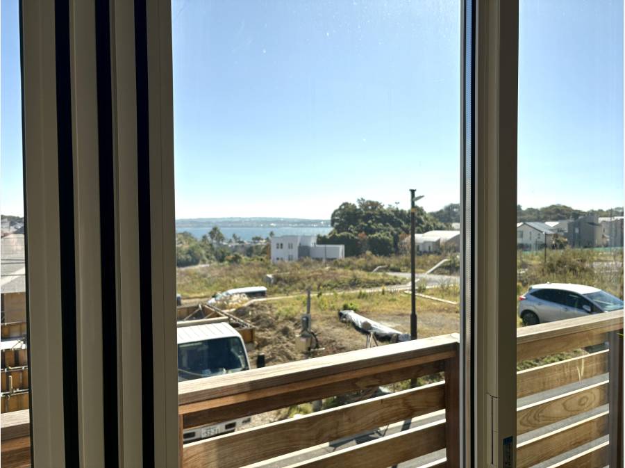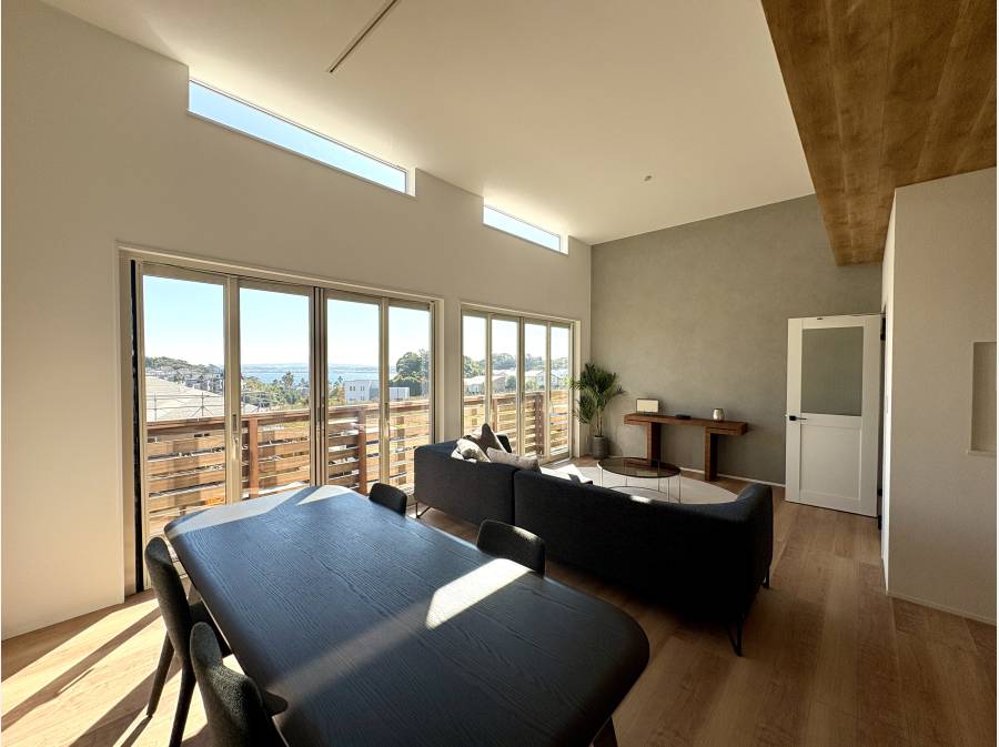 ウッドデッキへつながる大きな窓を開けると、佐島の空と風がそのまま暮らしの中に届きます。