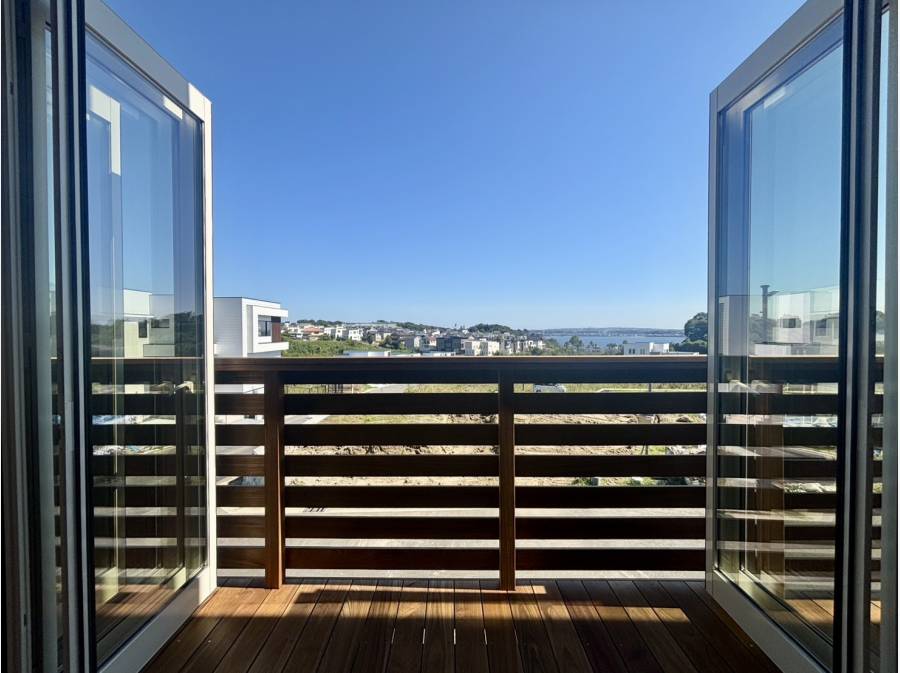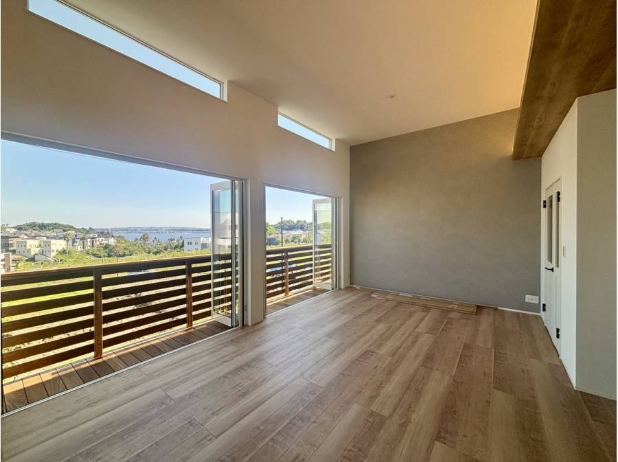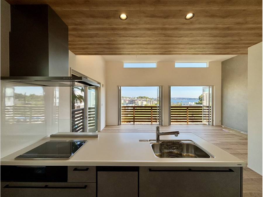 リビングは大きな窓から柔らかな陽射しが差し込み、爽やかな佐島の空気とともに心地よい時間を演出。白を基調とした外観デザインは、西海岸風の軽快さを感じさせ、海辺の街並みにしっくりと溶け込みます。