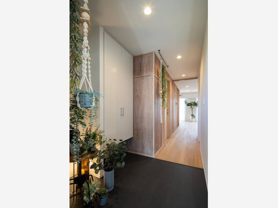 角部屋ならではの多くの窓からは、広がる空と小高い山並みがまるで絵画のように楽しめます。その景色に調和するように、室内は落ち着きのある柔らかなデザインに仕上げられています。