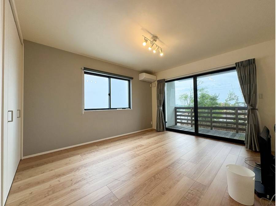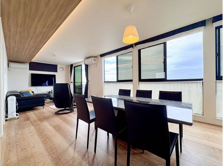 28帖を超える広さに加え、壁一面に設けられた窓から空と海を贅沢に堪能。