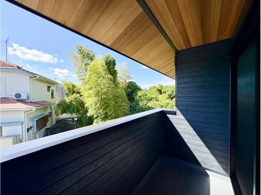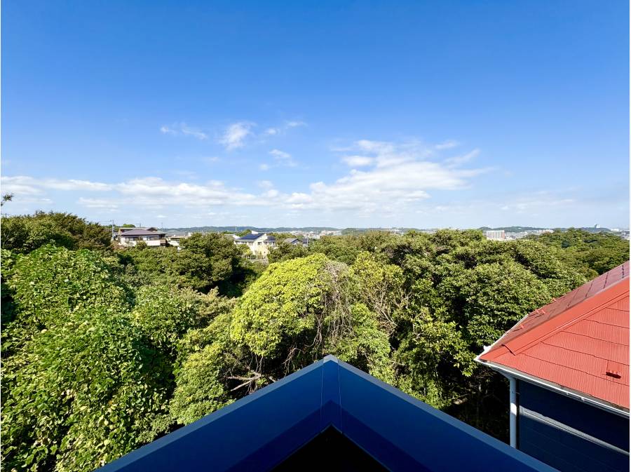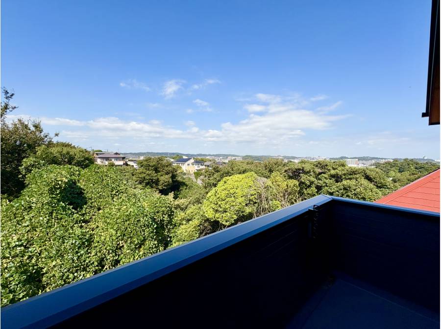この住まいの魅力は、何といってもその開放的な景色です。リビングの窓からは、遠くに広がる蒼い海を楽しめるだけでなく、バルコニーに出れば目の前の緑豊かな景色が心を癒してくれます。高台ならではの良好な陽当たりと、海と緑の両方を楽しめる眺望が、日常に特別な彩りを添えます。