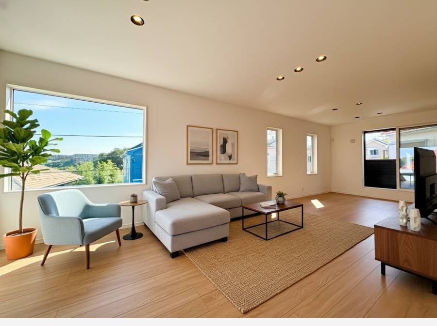 21.2帖の広々としたLDKは、陽光がたっぷり差し込む明るい空間。建物は断熱等級5、一時消費エネルギー等級6をクリアした、省エネ性能の高いZEH水準の住宅です。
