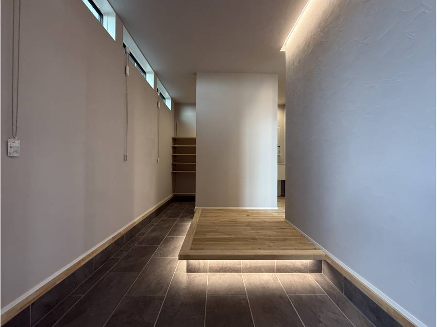 奥行きのあるアプローチは、昼間は木漏れ日が穏やかに揺れ、夜にはフットライトが柔らかく灯り、心地よい雰囲気を演出。