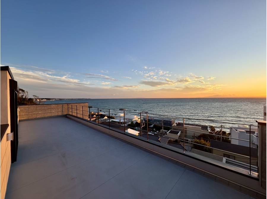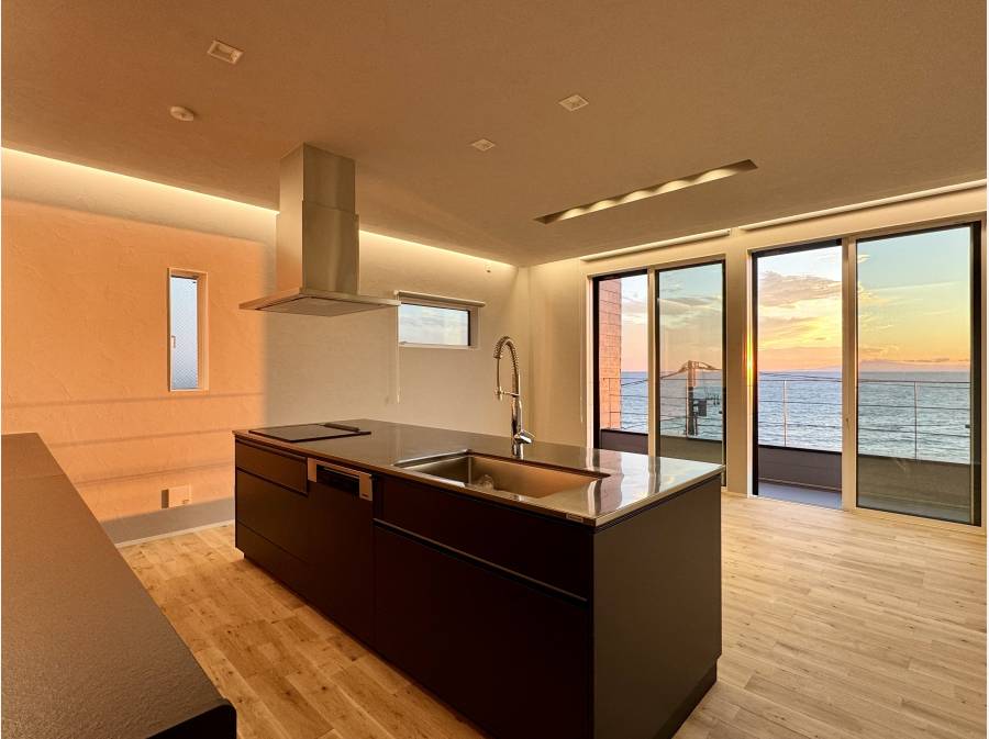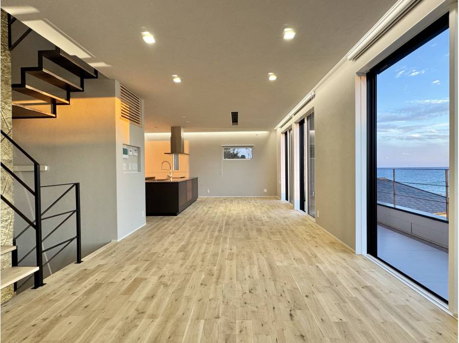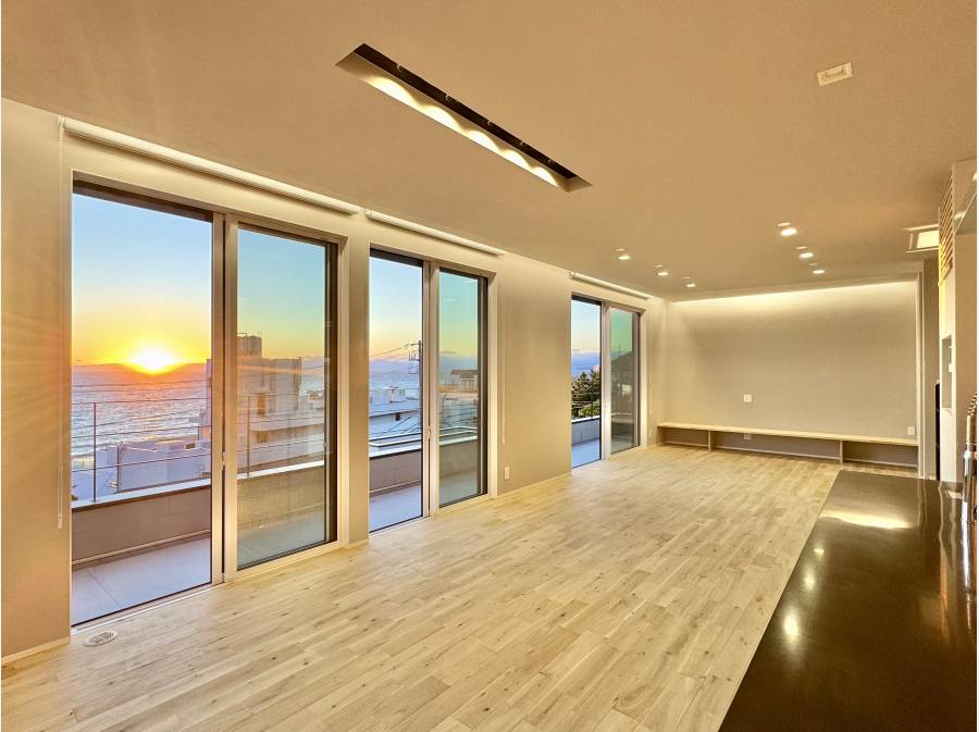 湘南の海と富士山を一望する、比類なきロケーション。直線的で無駄のないファサードは、モダン建築の美学を体現しながらも、内に入ると柔らかな光と木の温もりが調和する住空間となっております。オーシャンビューの屋上テラス、バスルーム、天井高を生かした大空間のLDK。すべての居室が「絵画」となるよう設計された邸宅です。