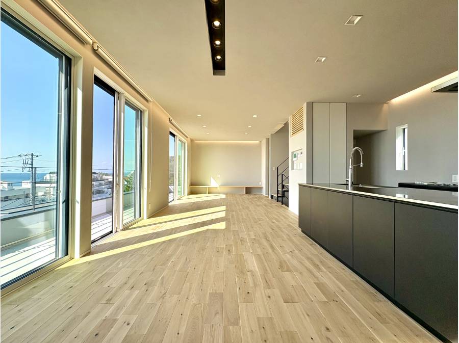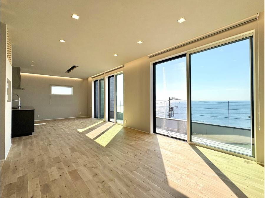 リビング、ダイニング、そして広大なルーフバルコニーから一望できるのは、青く輝く相模湾、その先に浮かぶ江ノ島、そして雄大な富士山の姿。