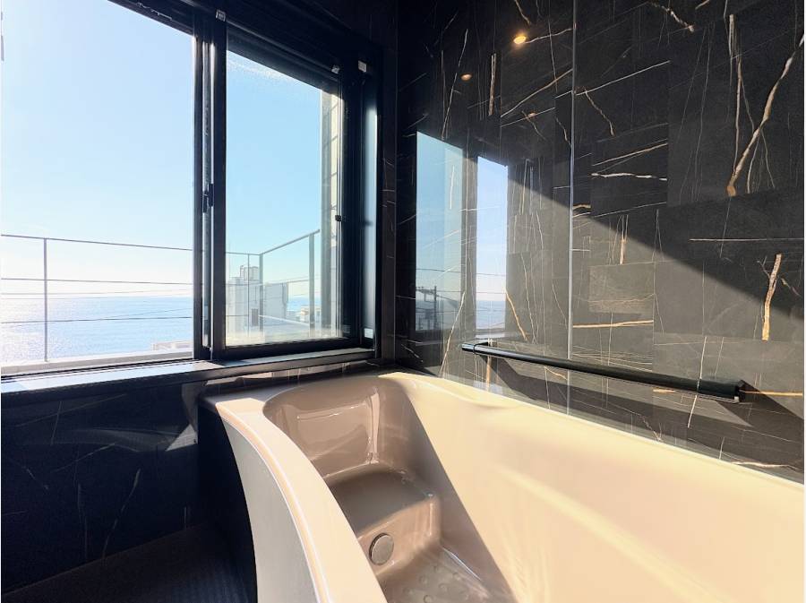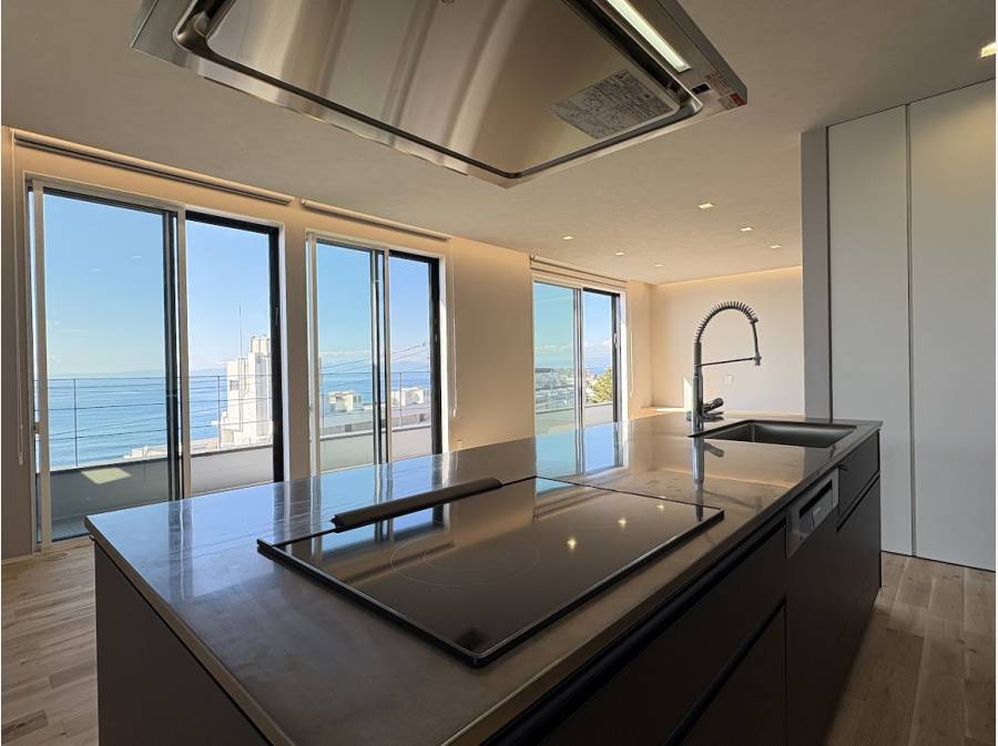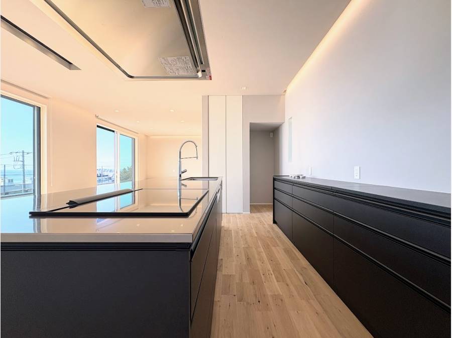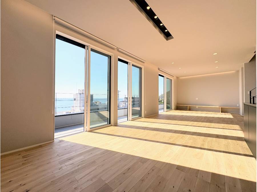 約26帖の広々としたLDKは、大きな窓から降り注ぐ自然光が明るさと開放感を演出。リビングから見える海の景色は、家族がくつろぐひとときをさらに特別なものにしてくれます。