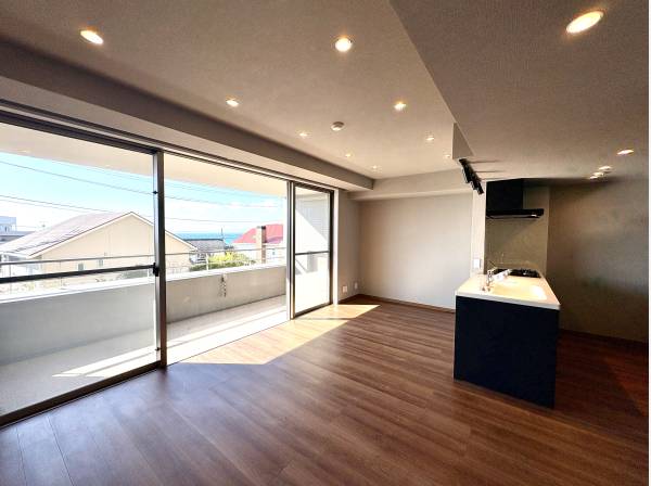 今回ご案内するお住まいは1階にありますが、下階が駐車場となっているため、実質的に高さを感じることができます。大きな窓の向こうには海が見え、自然と開放感が日常に生まれます。フルリノベーション済の室内はブラックのアクセントが効いた落ち着いた雰囲気で、リビングと隣室をつなぐ室内窓が光と風を優しく取り込み、空間全体に心地よさが広がります。