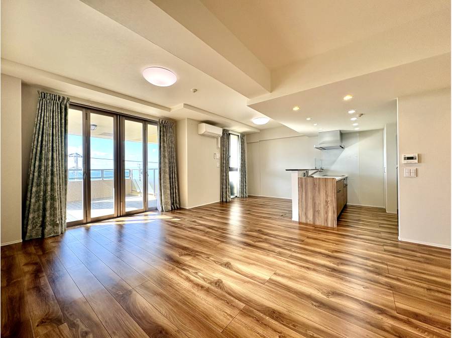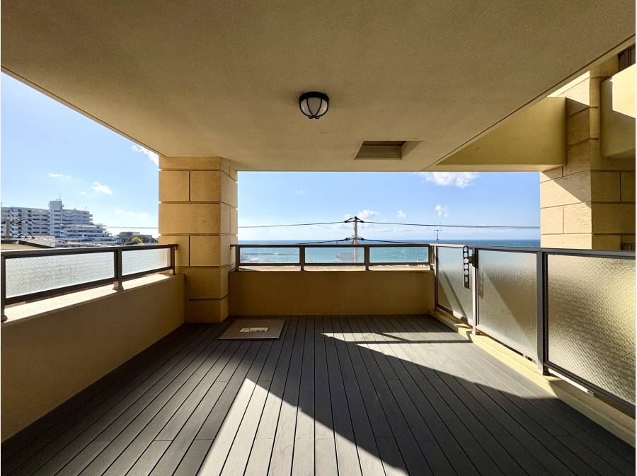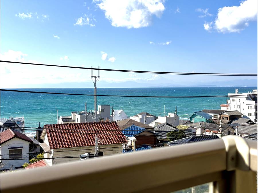 海と富士山、夕陽を楽しめる贅沢な住まい。駐車場付きで、21.2帖LDKとバルコニーが魅力。