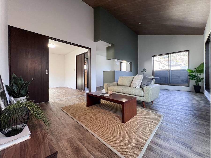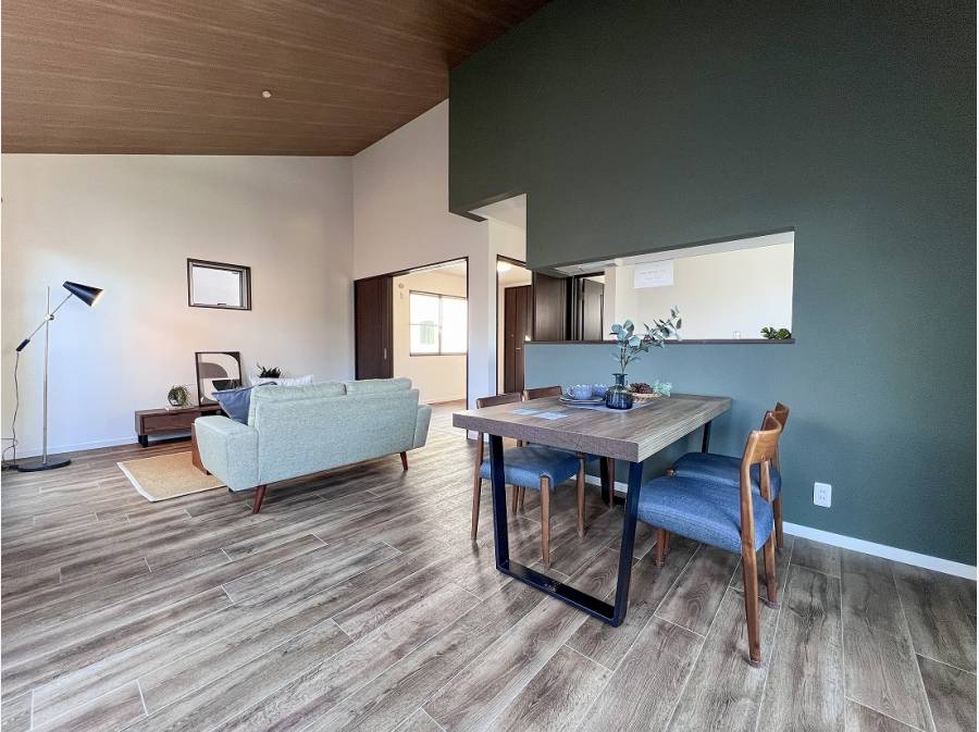 板張りの勾配天井がより広い奥行きを与え、木の温かみと開放感に包まれます。