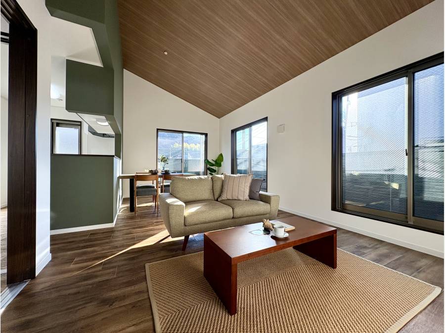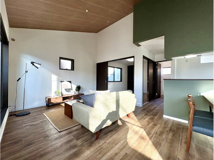 本住戸の主役は、2階に配された約18帖の広大なLDK。天井が高く設計されており、降り注ぐ陽光と相まって圧倒的な開放感を演出します。