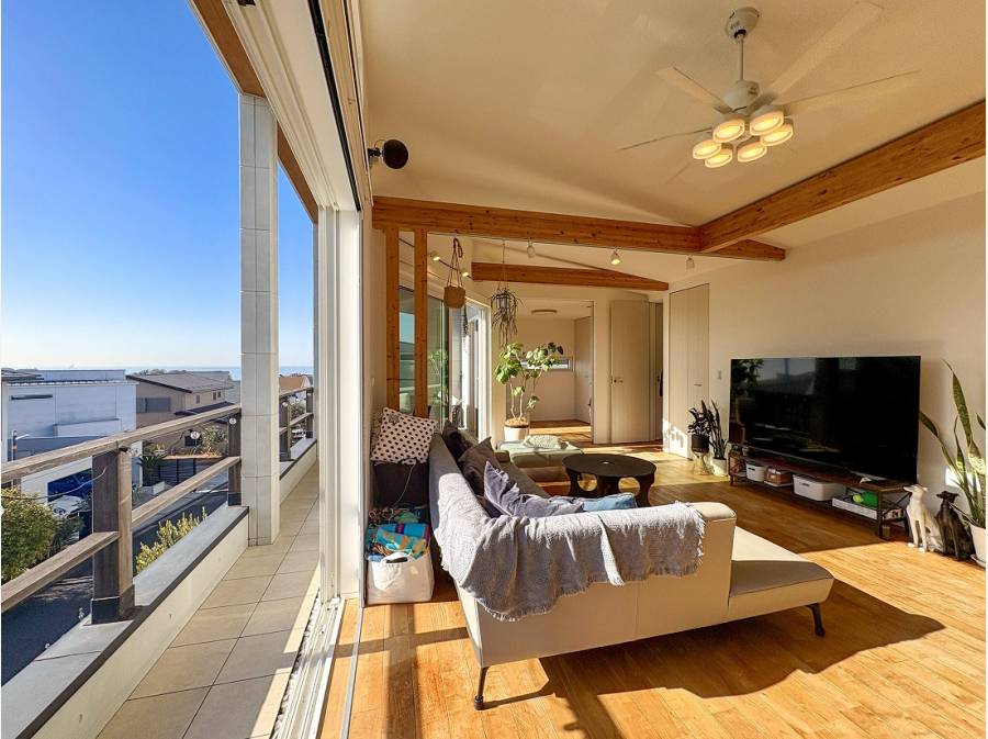 リビングと繫がるバルコニーにガーデンソファを置いて、煌めく水平線を愛でながら素敵な時間を過ごせます。