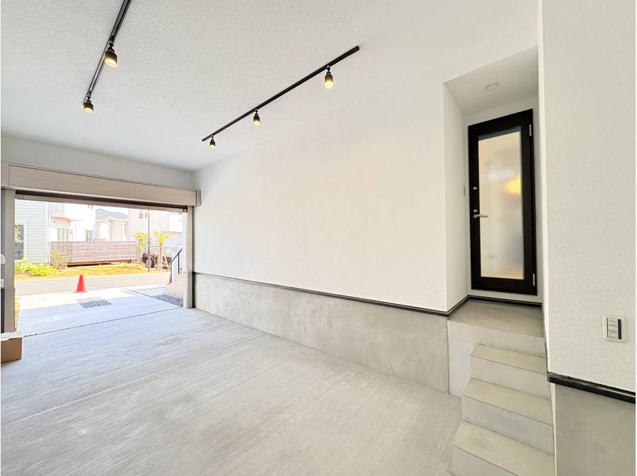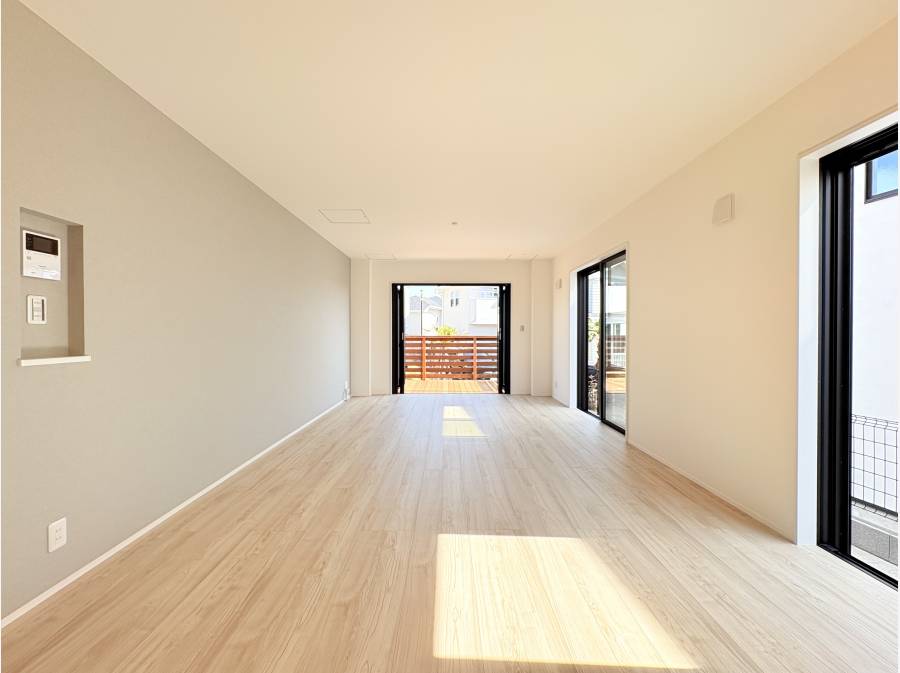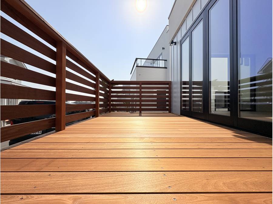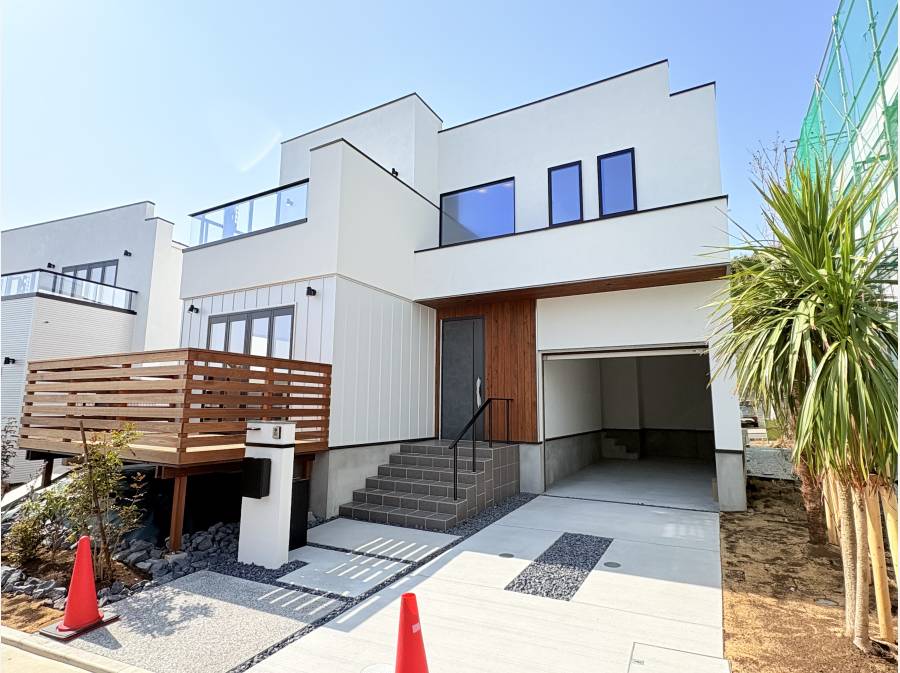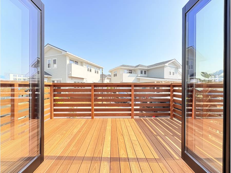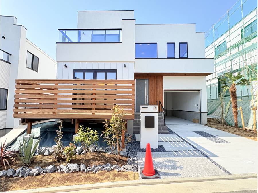 ガレージハウス仕様で、贅沢な暮らしを楽しめる一邸です。東南向きのデッキスペースは陽当たりが良く、セカンドリビングとしても活用できます。