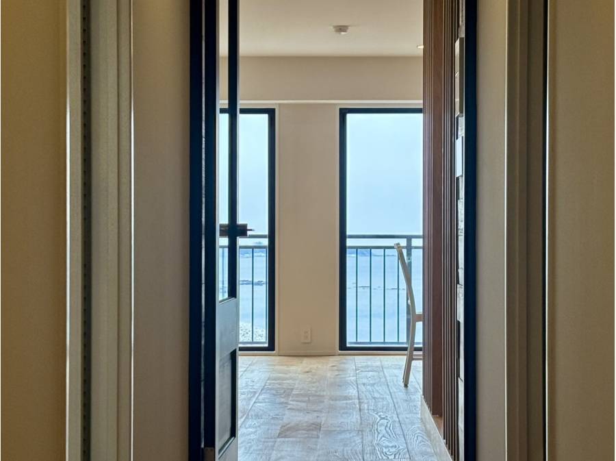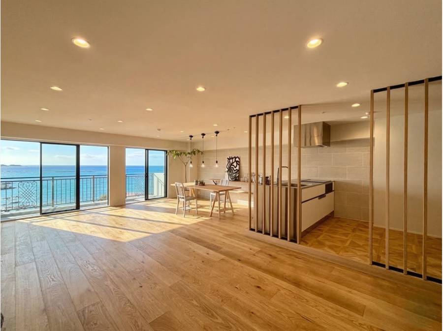 お部屋は約81㎡のゆとりある1LDK。広々としたリビングダイニングは、海と空を感じながらゆったりと過ごすことができる心地よい空間となっています。大きな窓から差し込む自然光が室内を明るく照らし、時間帯によって変化する海の表情を楽しむことができます。