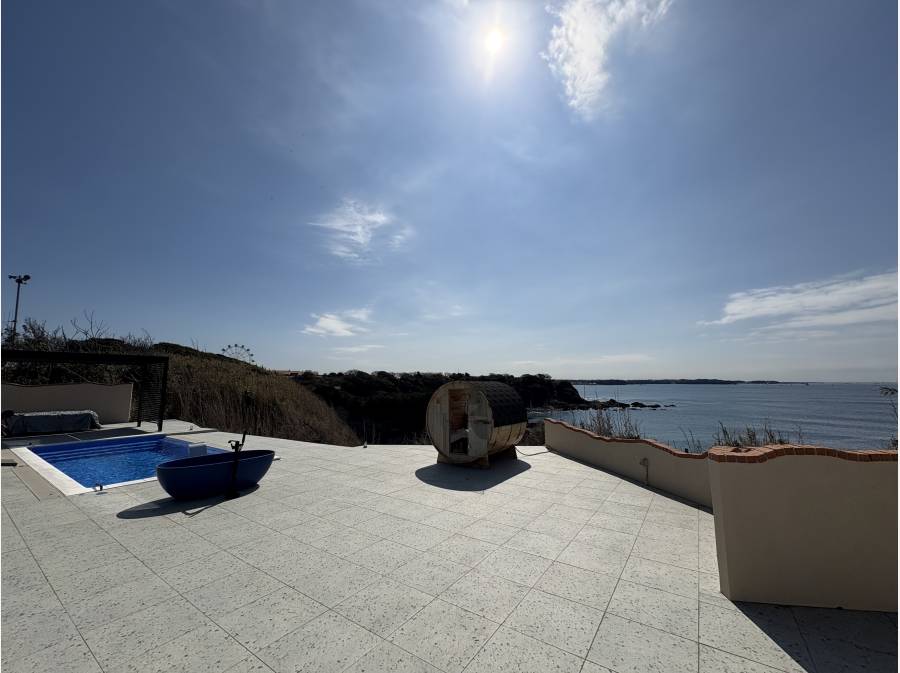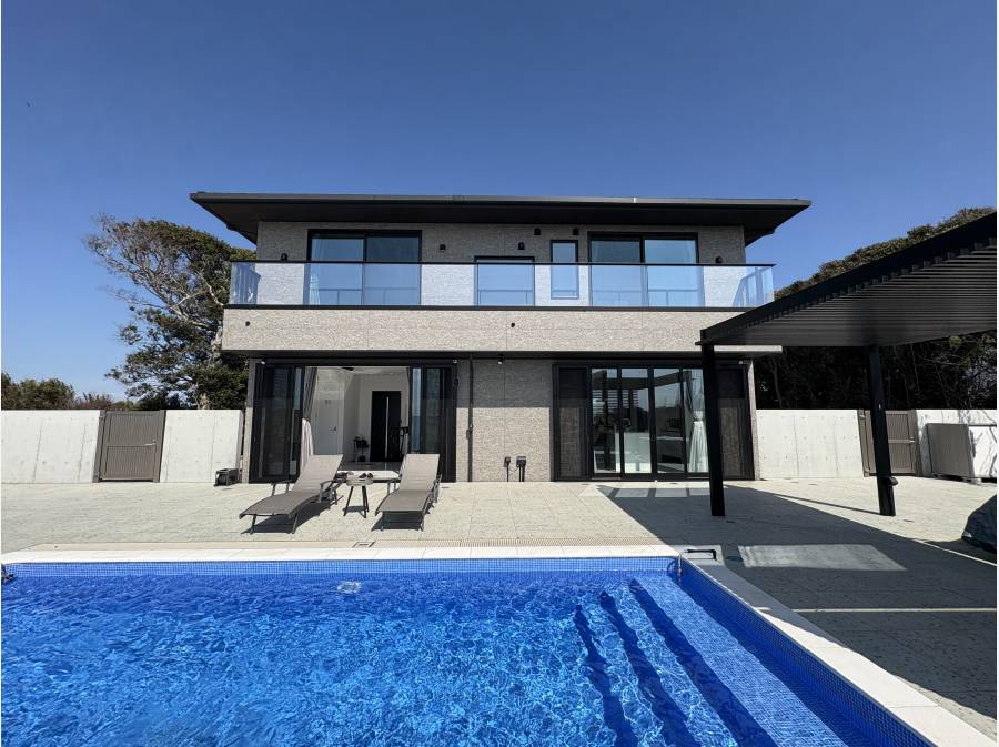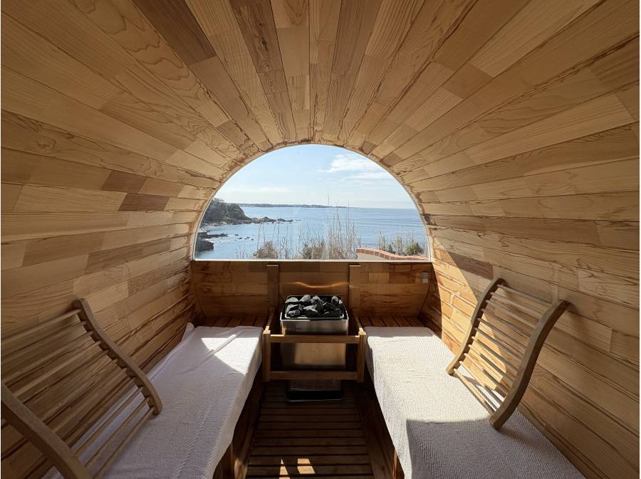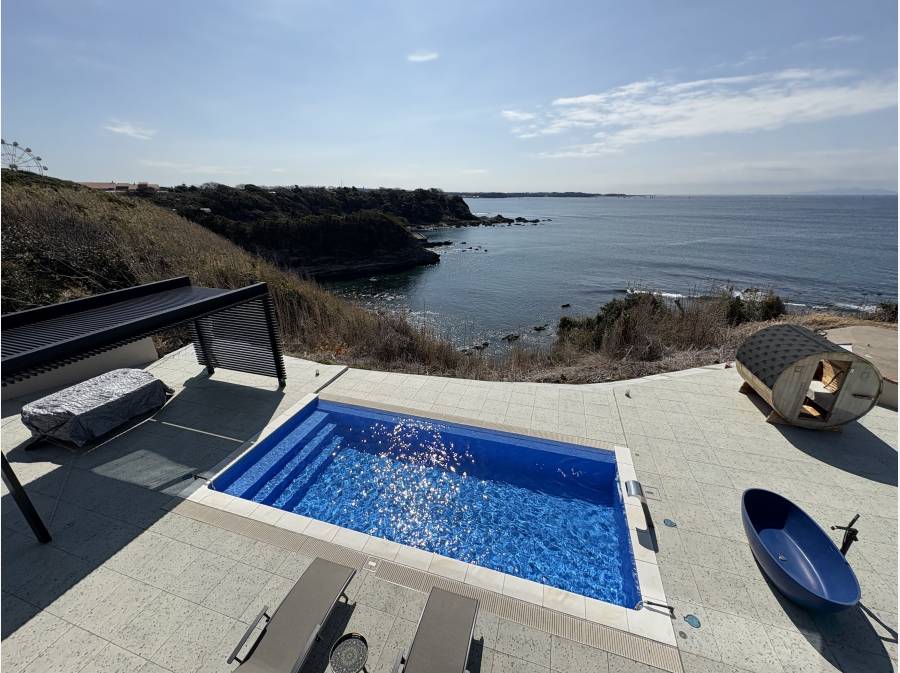 大島や富士山を望む景色が広がり、プールやサウナ付きのプライベートリゾート感を楽しめます
