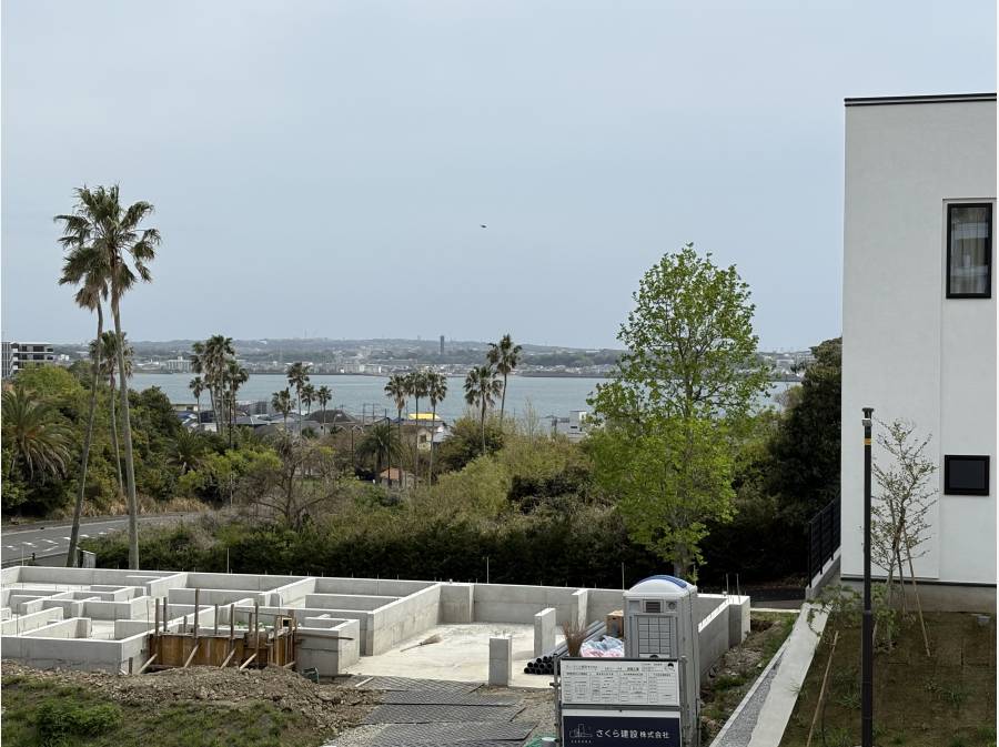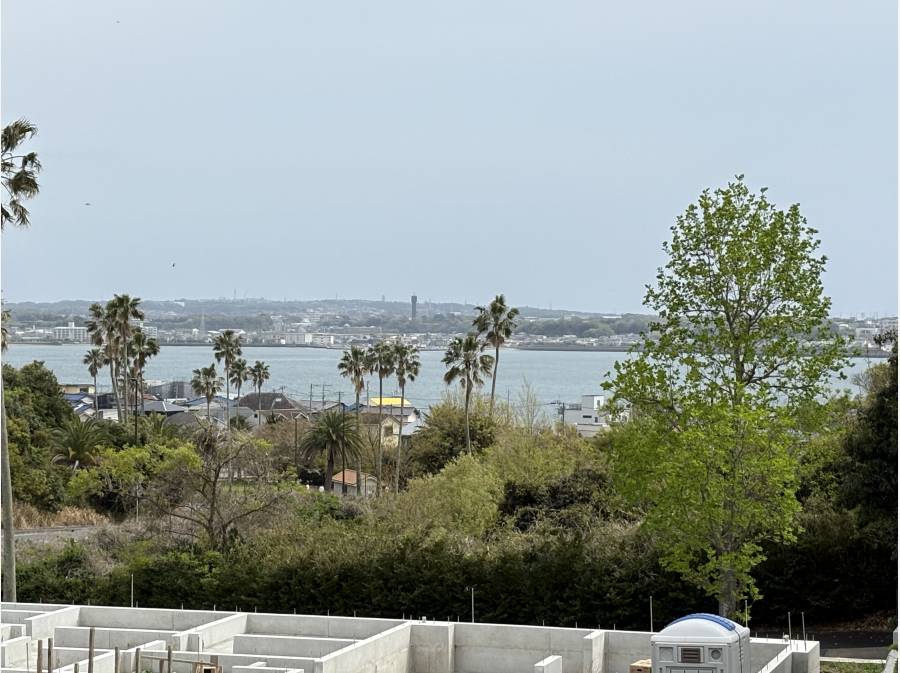 基礎の写真と隣地建物の窓位置、パースを見比べると、海が見える様子をイメージいただけるでしょう。