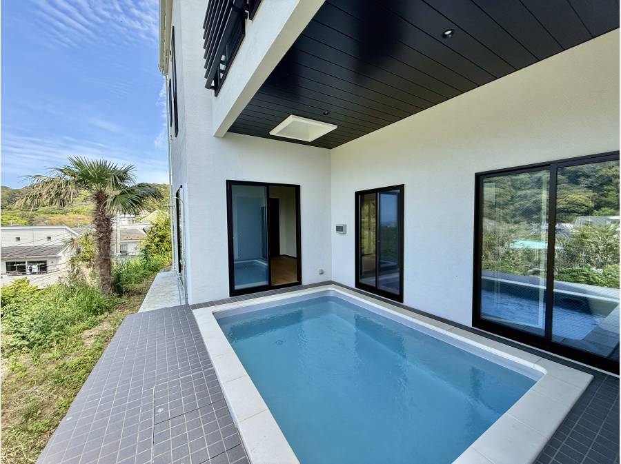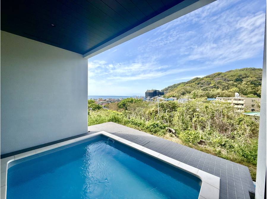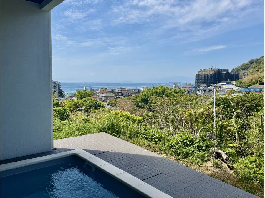この邸宅の魅力は、バスルームから直接つながるオーシャンビュー・プール。緑の先に広がる相模湾、そして富士山を眺めながら過ごすひとときは、日常を忘れる楽園のような空間です。
