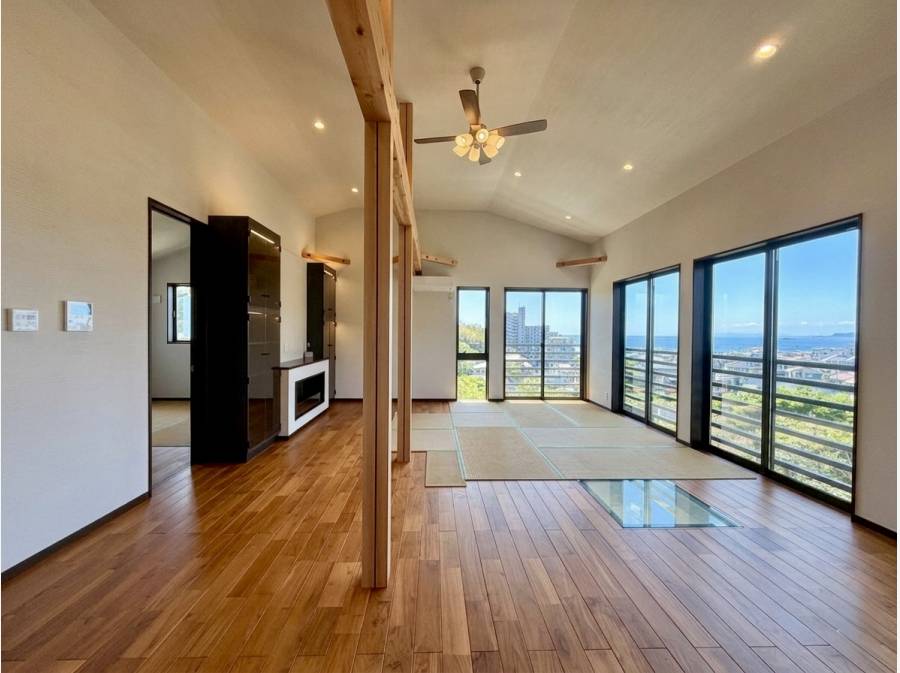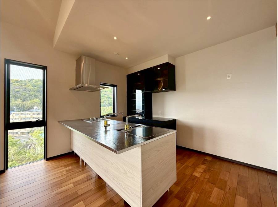 秋谷に位置する新築デザイナーズハウスをご紹介します。30帖を超える広々としたLDKは、窓の外に広がる景色を楽しみながら、ホームパーティやリラックスした時間を過ごせる魅力的な空間です。