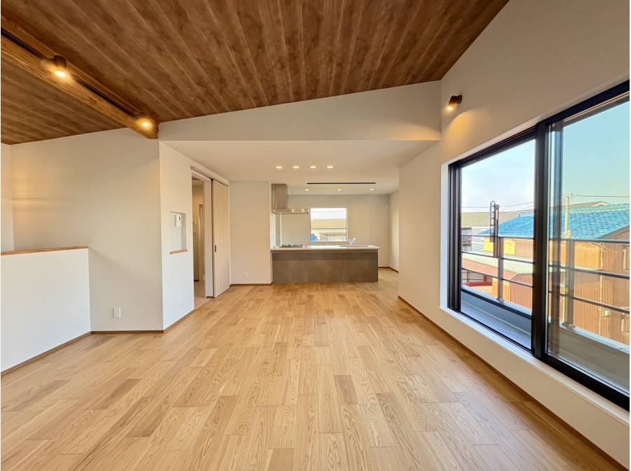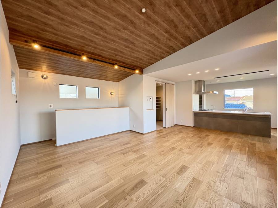 ホールの先にある階段をのぼると、勾配天井で開放感あふれる約22帖の空間が広がります