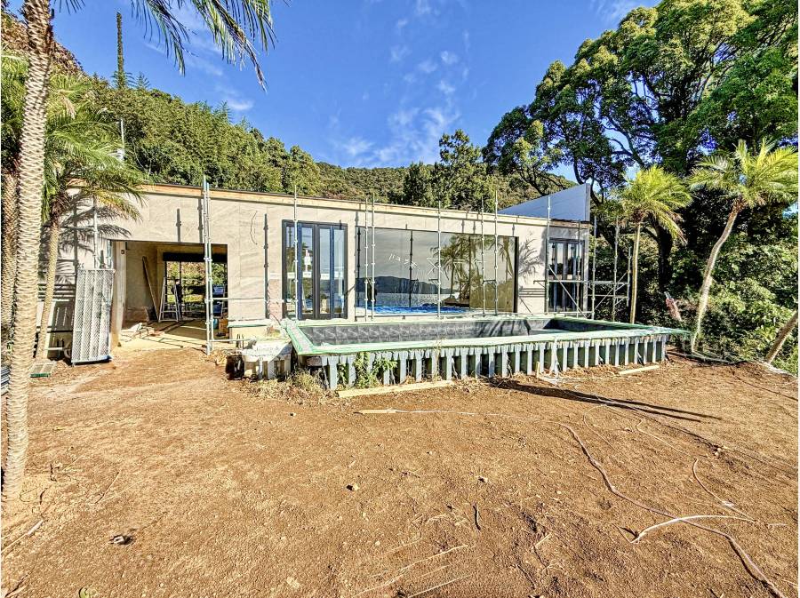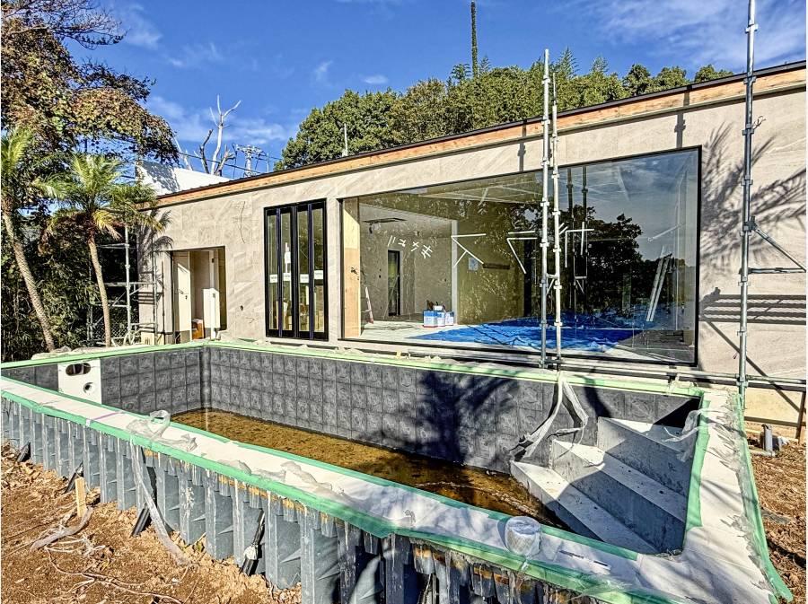 北側道路で、南側には大開口のLDKと大きく迫り出したウッドデッキテラスにプライベートプールがあり、そこからは宇佐美の海を大迫力で望みます。