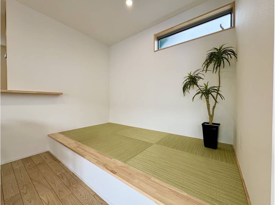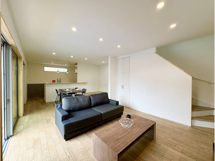 約22帖のLDKはタタミコーナーやウッドデッキとつながる設計で、子どもたちが遊ぶ姿を見守りながら料理をしたり、デッキでランチやバーベキューを楽しむなど、家族の時間を広げる工夫がいっぱいです。