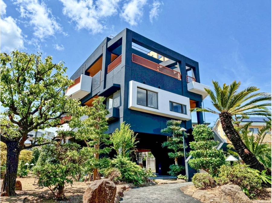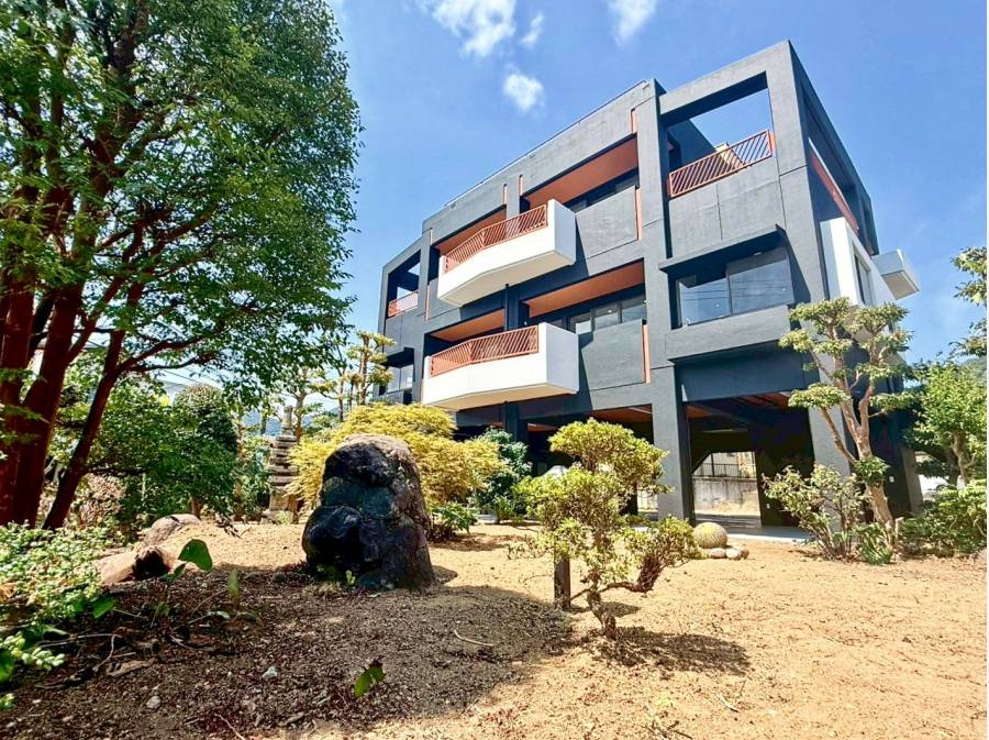 緑豊かな山々に囲まれた穏やかな住宅街に突如現れるモダンな佇まいの邸宅。