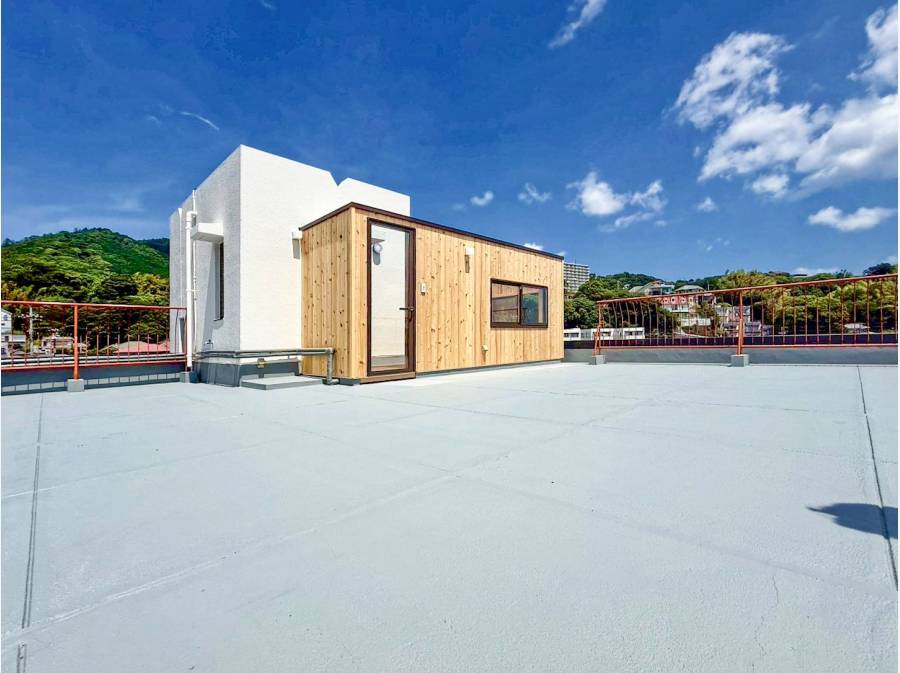 3階の大型バルコニー、ルーフバルコニーから宇佐美海岸の海を望む物件で、