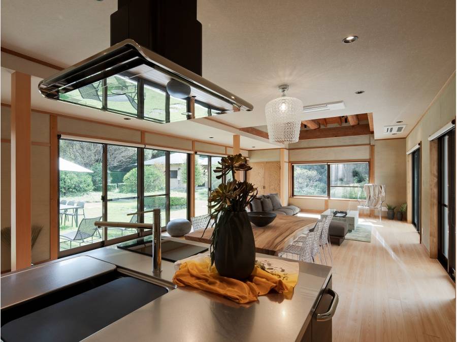 リビングは和の設え活かした開放的な洋室へ、木のぬくもり溢れる囲炉裏空間や茶室なども完備されています。
