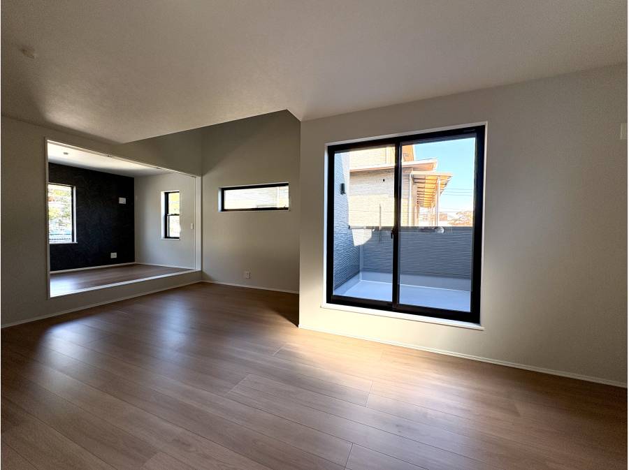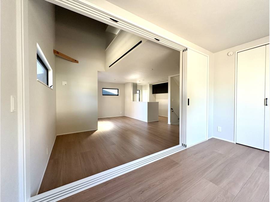 外からの視線が入りにくく、吹抜とつながる5帖の洋室を開放すると、気持ちがふっと軽くなるような広がりが感じられました。