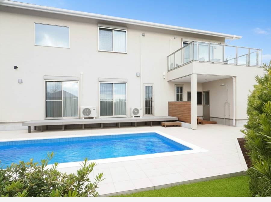 ゆとりある約135.8坪の敷地に温泉、サウナを兼ね備えた本宅と3台分のカースペース、リゾート物件らしいプールを擁するリゾートハウスです!