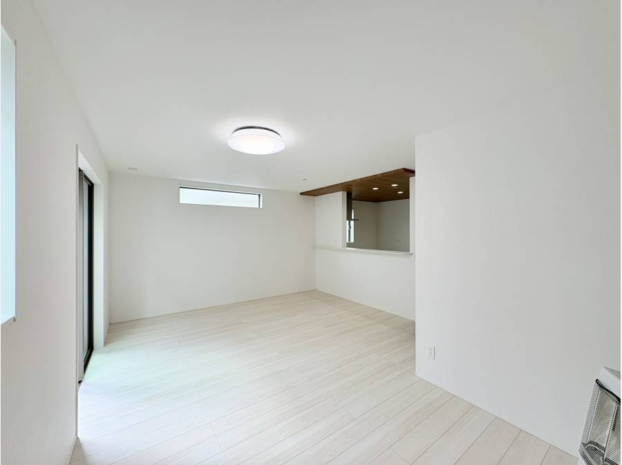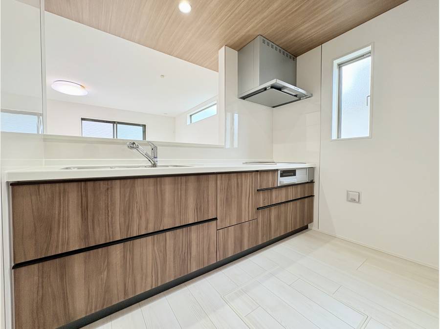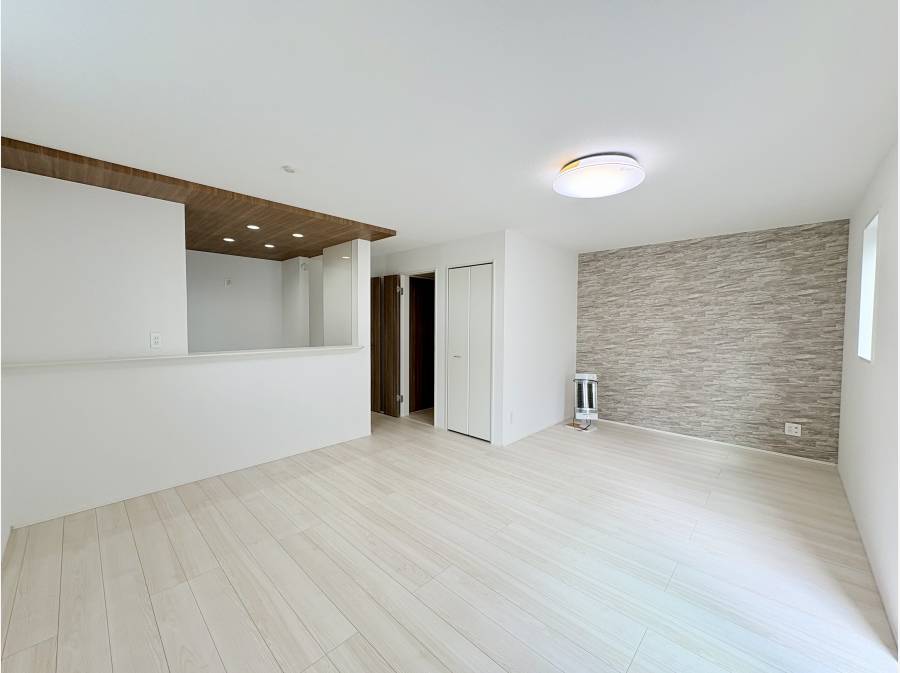 LDKは17帖あり、対面式のシステムキッチンが特徴。ご家族とゆったり過ごせる快適な空間にお洒落なアクセントクロスが彩りを添えます。