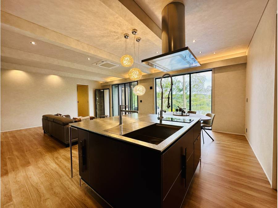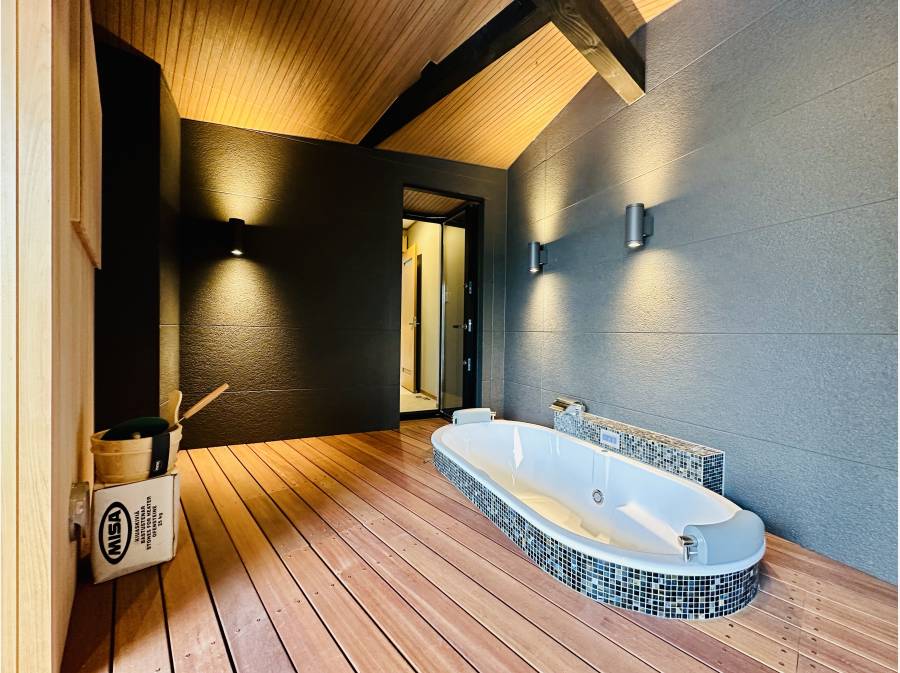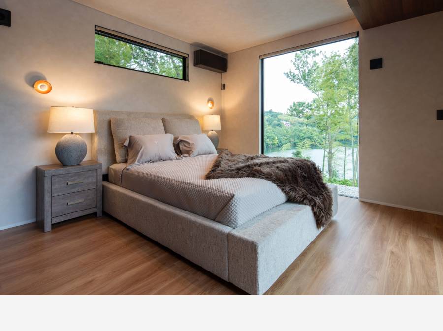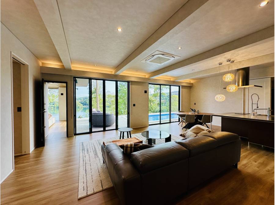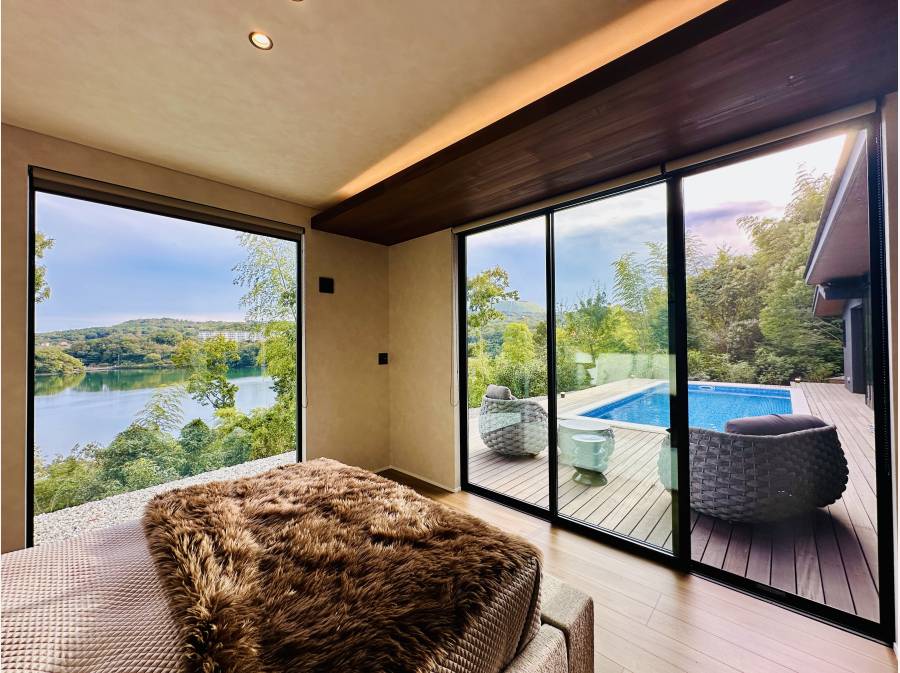 重厚感ある門扉を車で抜けると、母屋と離れ棟が現れます。母屋は約207㎡超の平屋建で、約30帖の広々としたLDKや主寝室を含む2部屋、そしてジャグジーやバレルサウナ、湖を望むプールを備えています。離れ棟は1LDK、さらにゲストハウスは3LDKで、大勢の方が宿泊可能ですので、別荘や社用の保養所としてもおすすめです。