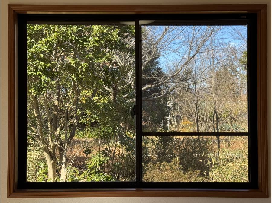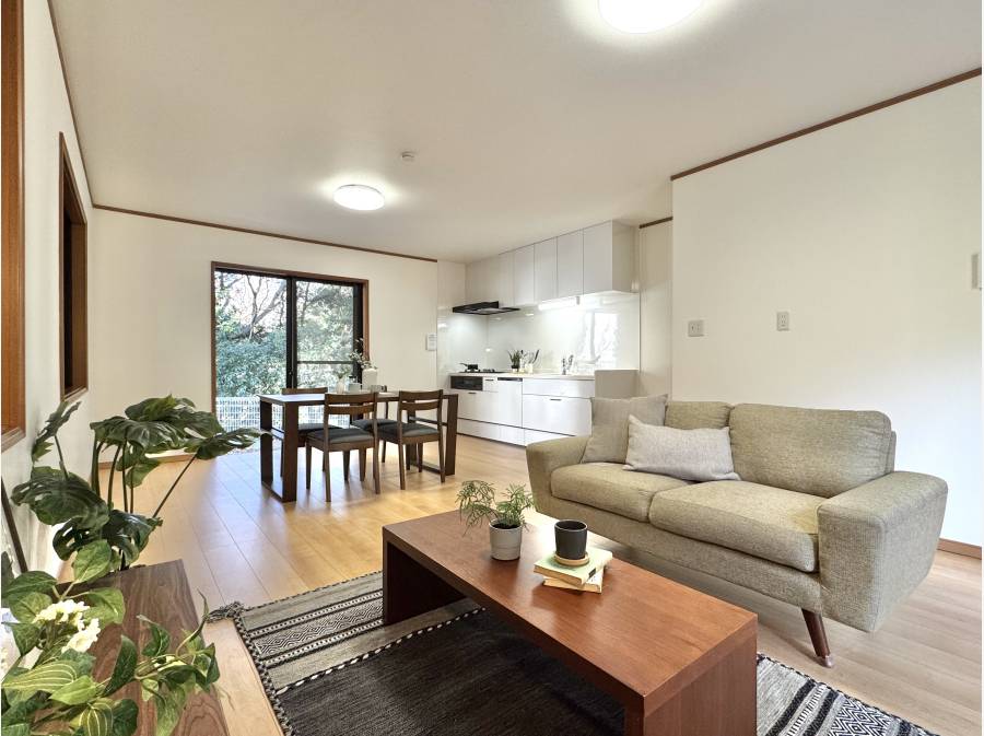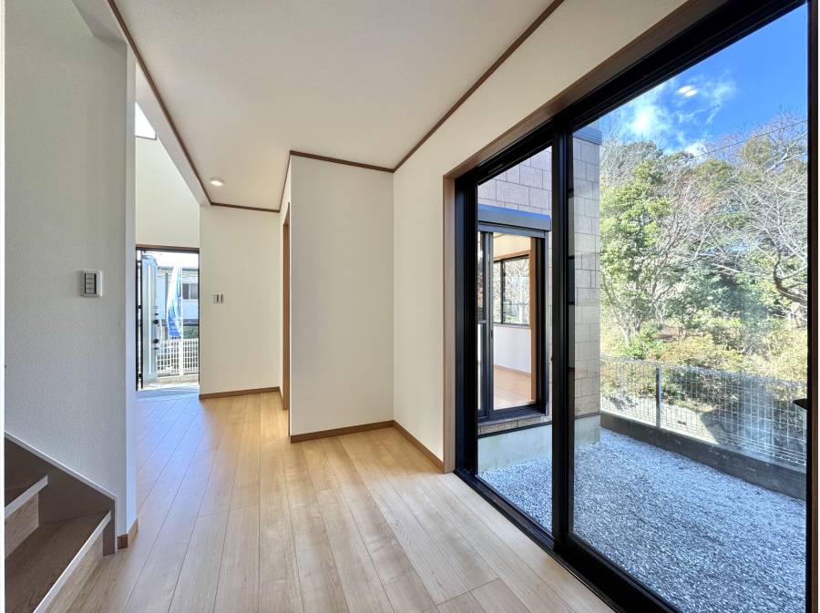 大きな窓の先に広がるのは、四季の移ろいを感じさせる緑の借景。朝はやわらかな陽光が室内を満たし、窓を開ければ森の気配がそっと日常に溶け込みます。