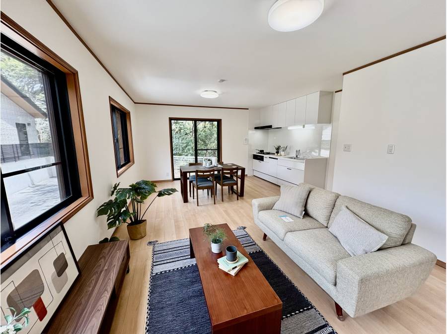 コの字型の間取りで3方向に窓があり、明るく開放的。2階からは海が見える魅力的な眺望も楽しめます。裏庭付きで、内外装フルリフォーム済み。駐車は並列で2台可能です!