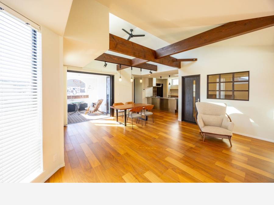 外観だけでなく、玄関ホールに足を踏み入れると、白い塗り壁と土間タイルのコントラストが魅力的で、木の温もりが調和する空間が広がります。吹き抜けの大空間LDKは、開放感にあふれ、住む方を魅了します。