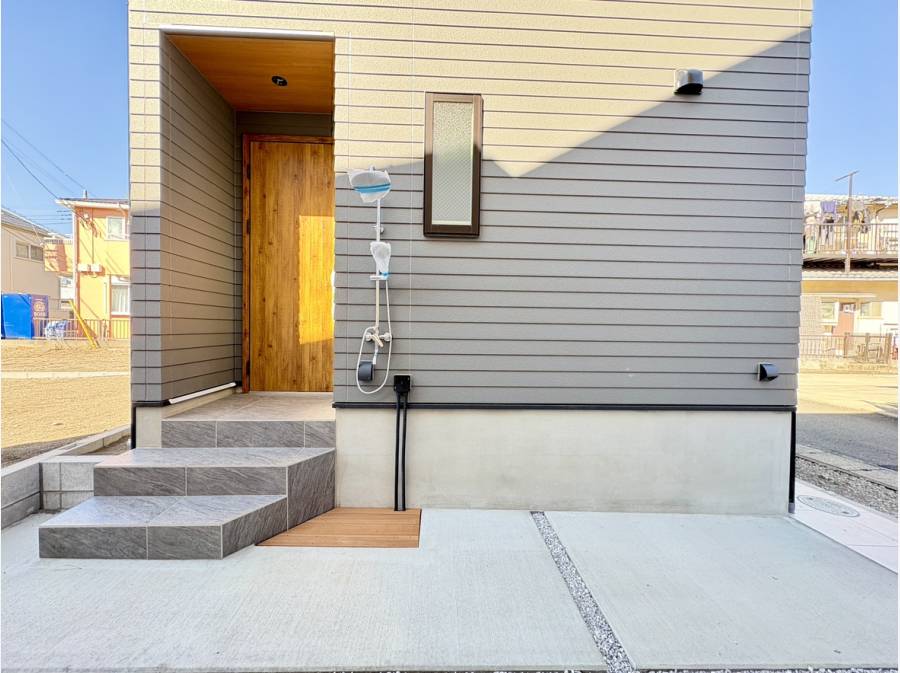 玄関傍には、海やアウトドア帰りにも便利な温水シャワーを完備!