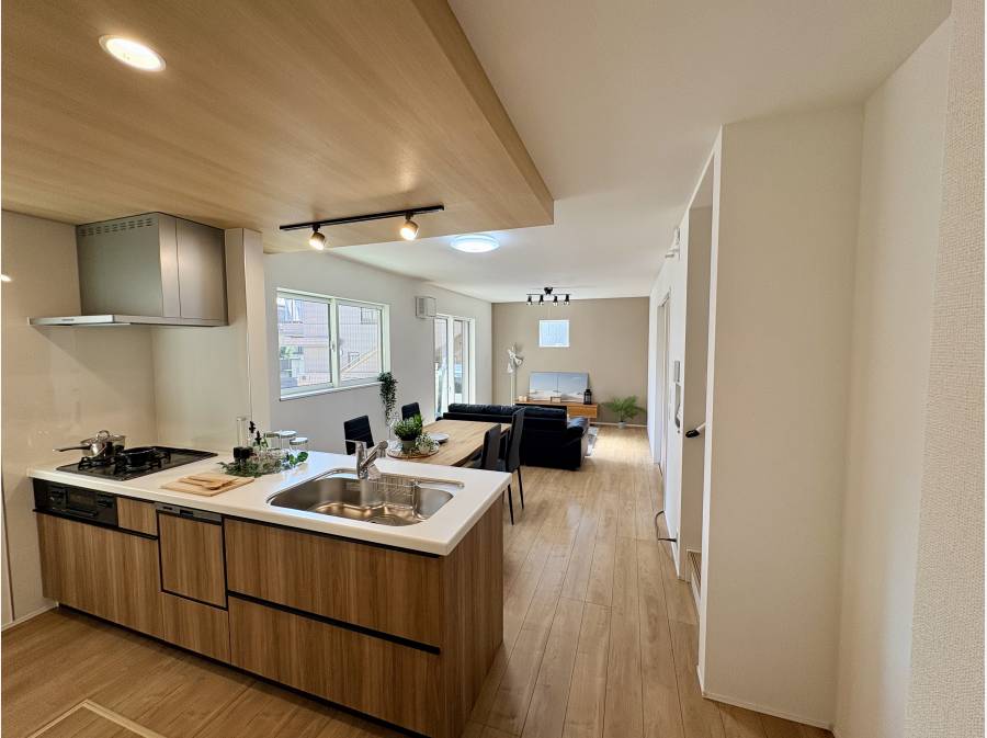 木目調の天井がアクセントの明るく広々としたリビングは、家族の笑顔を見渡せる対面キッチンを採用。団らんのひとときをさらに楽しくします。