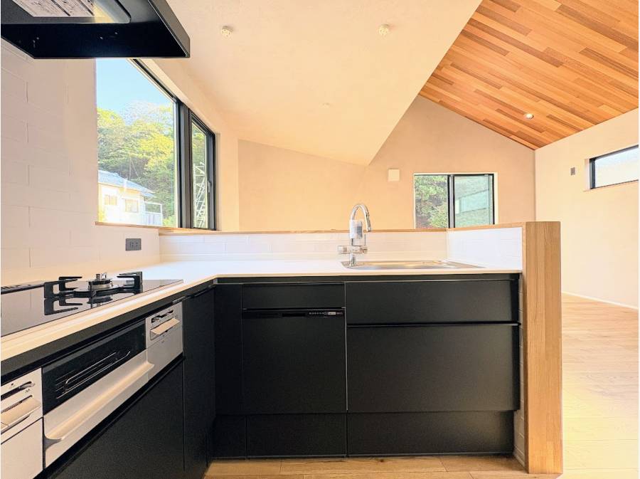 ウッド調の外観は、葉山の豊かな自然と見事に調和。内装では、板張りの天井が特徴のLDKが木の温もりを感じさせ、心地よい空間を作り上げています。