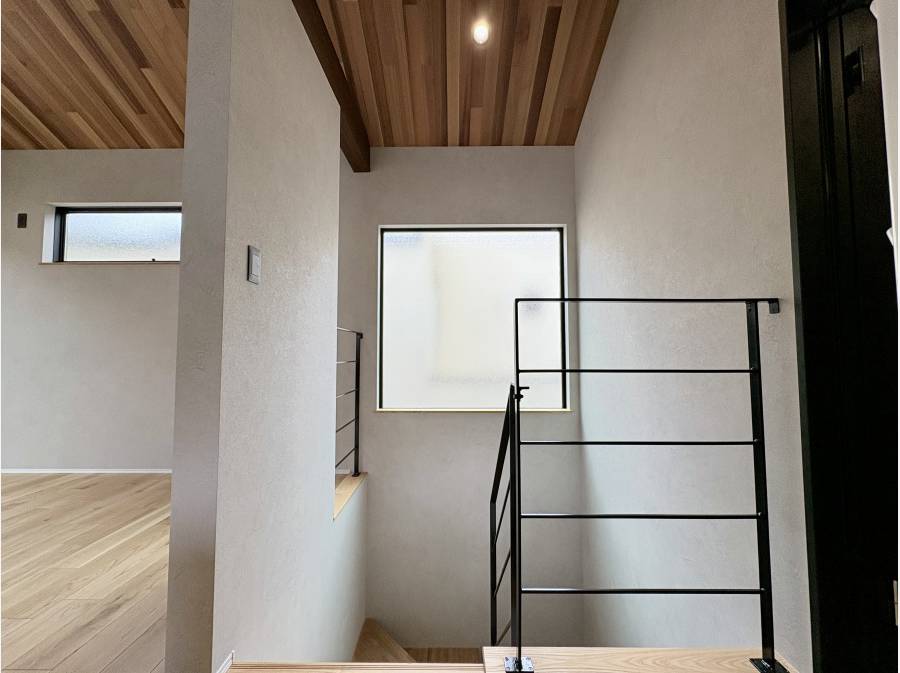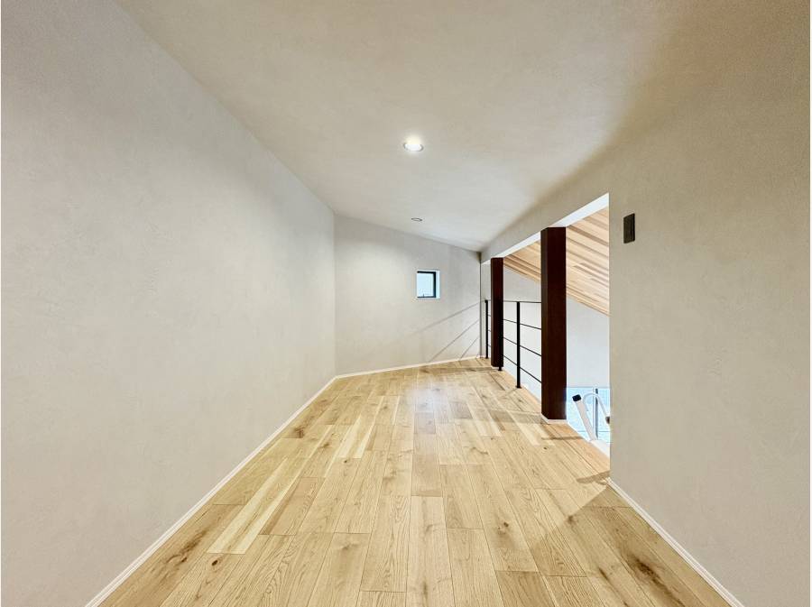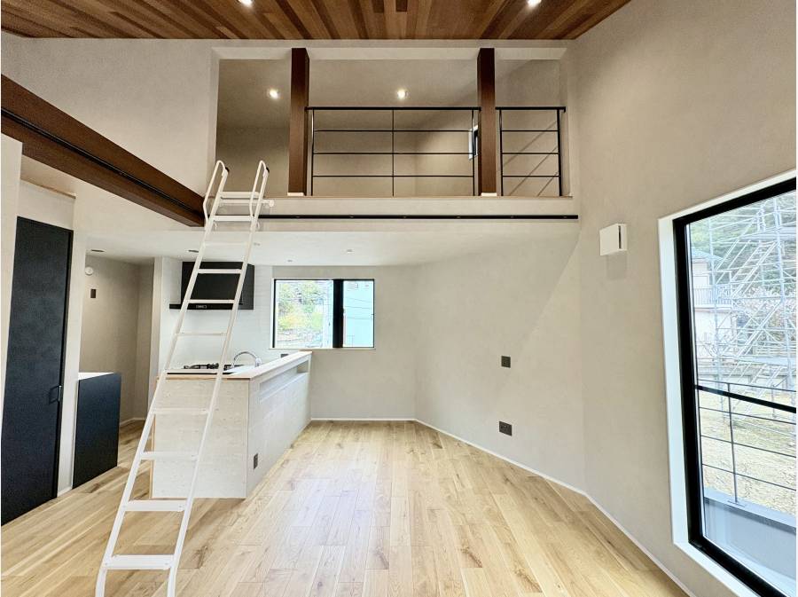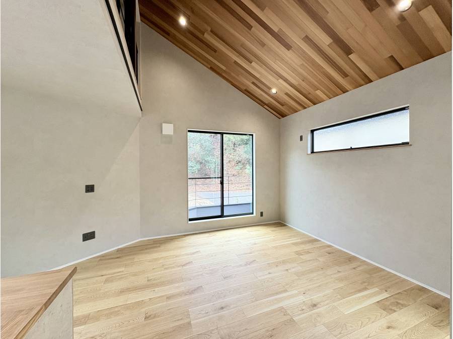 二階にLDK。勾配屋根に高窓を設け、ご家族で落ち着いて過ごす空間が広がります。木材を使用した天井と床。木の香りに包まれ、帰宅すれば安らぎを感じる生活が叶います。さらにロフトを設け収納性も完備しています。