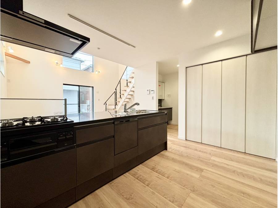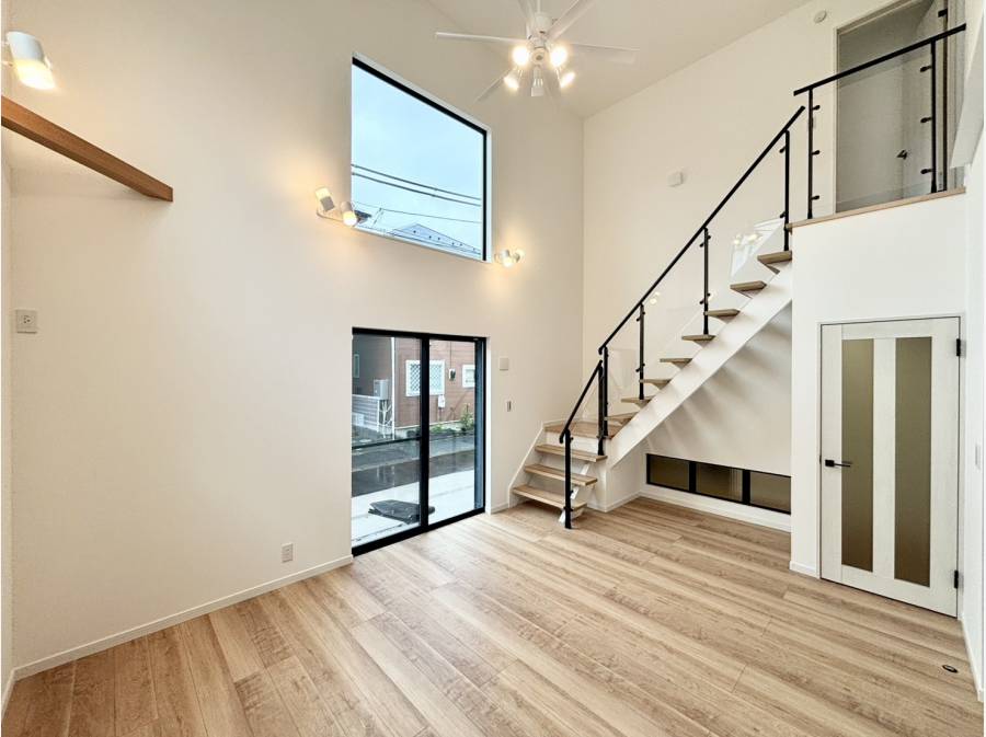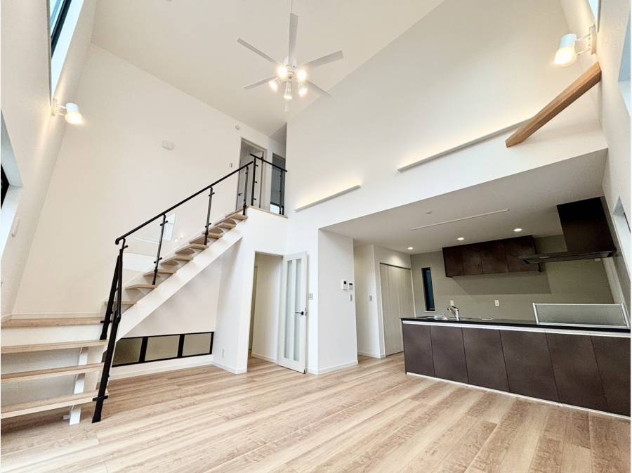 室内に入ると、吹き抜けを中心に構成された明るく開放的なリビングが広がります。約17.8帖のLDKは、陽光がたっぷりと差し込み、家族が自然と集まる穏やかな空間。キッチンからリビングを見渡せるレイアウトで、日常の会話が心地よく交わります。