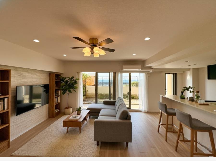 間取りは3LDKで、広々とした約18帖のLDKから海を望むことができ、穏やかな時間を過ごせます。また、専用通路を通れば徒歩1分で海岸に到着するため、海辺の暮らしを存分に楽しめます。