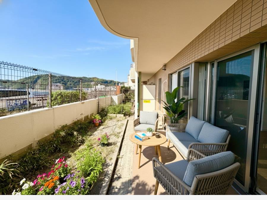 1階のお部屋ながら、専用庭と開放感あふれるテラスが付いており、海を眺めながらのティータイムや読書など、休日をゆったりと過ごすことができます。