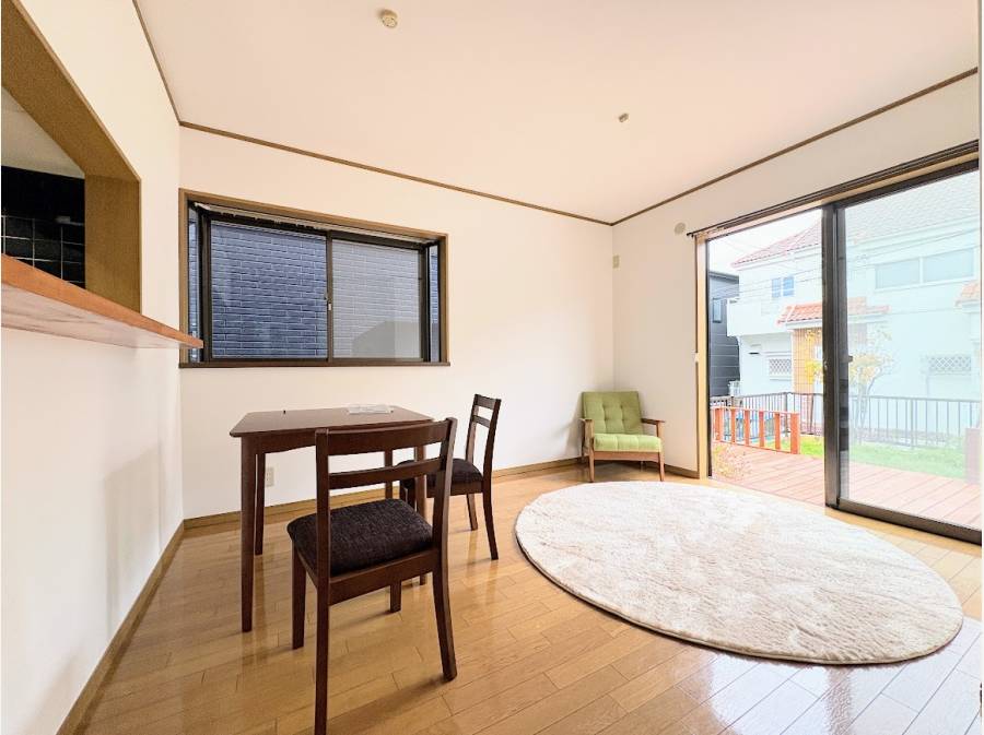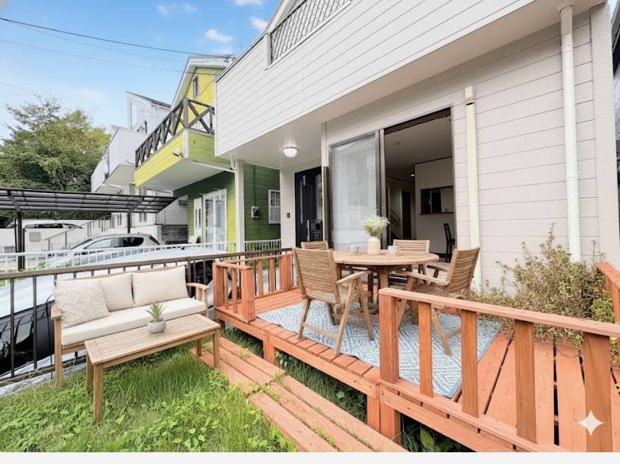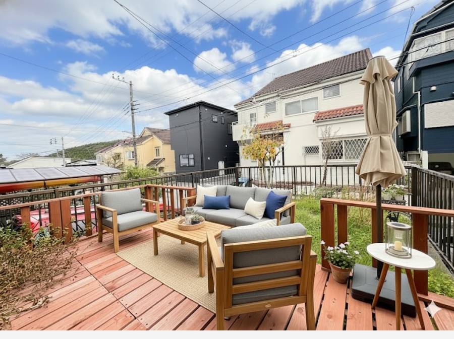 特に目を引くのが、日当たりの良いウッドデッキです。休日にはここで読書をしたり、リラックスした時間を過ごしたりと、葉山の穏やかな空気を存分に楽しめる空間が広がっています。