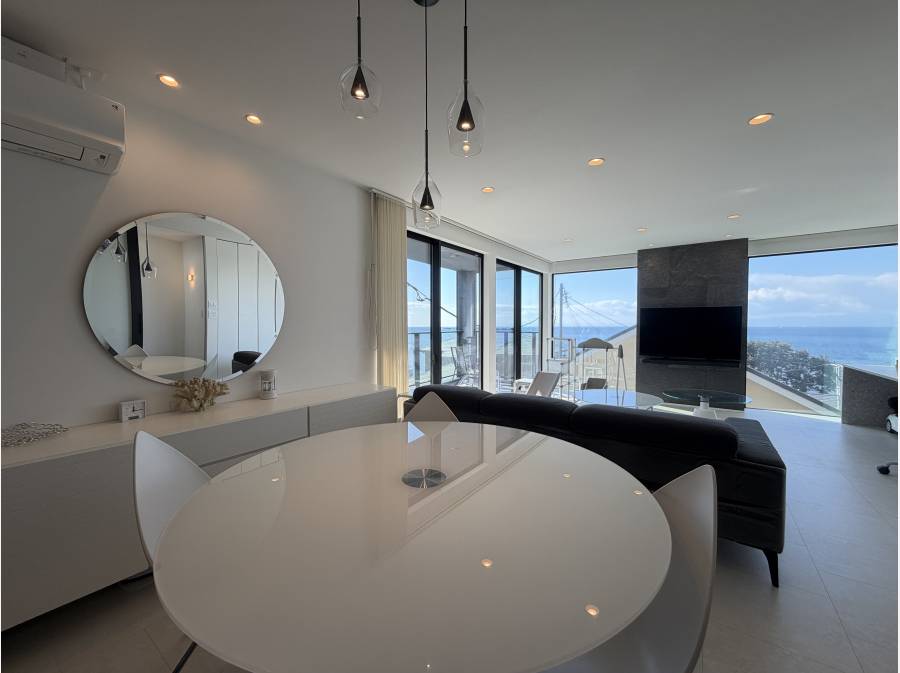 リビングに足を踏み入れた瞬間、目の前に広がるオーシャンビュー。その先には堂々とした富士山の姿も望める、贅沢なロケーションが魅力的な一邸です。