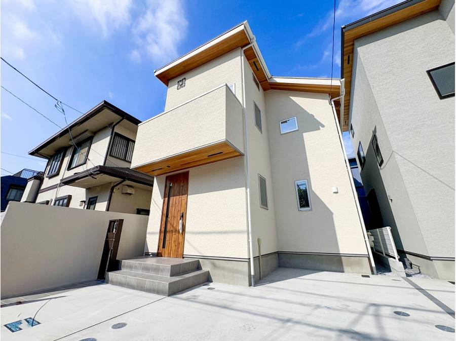 向かって左に佇む1号棟はウッドの玄関ドアが優しいトーンの外壁にマッチしたおしゃれなお住まい。