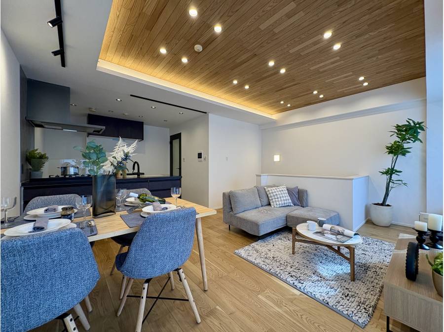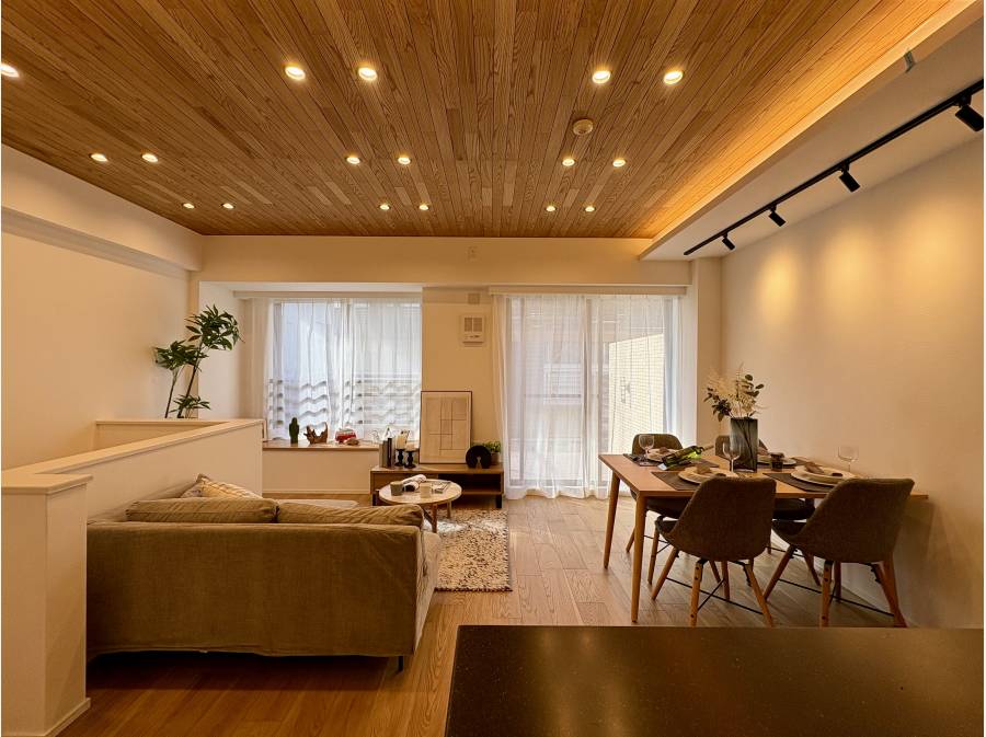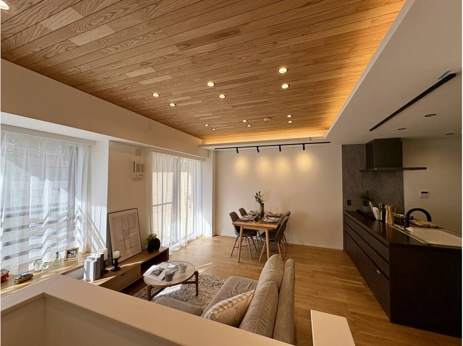 今回のリノベーションでは、LDKや廊下にオーク材の突き板フローリングを使用し、リビングダイニングの天井にもオーク材パネルを採用。天然木ならではの温もりが、室内にいながらも自然とつながる心地よい空間を創り出します。
