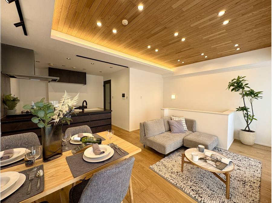 約14.8帖のLDKにはオーク材の突き板フローリングが使用され、自然素材の心地よさを感じる空間です。