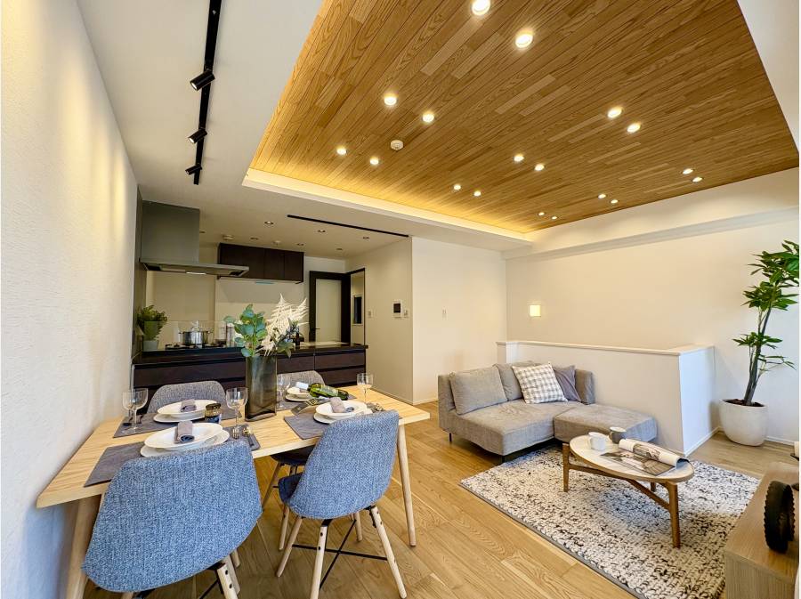 内装はオーク材の突き板フローリングが美しいリビングや、食洗機付きの最新システムキッチン、そして癒やしの空間となるユニットバスなど、リノベーションにより新築のような仕上がりになっています。