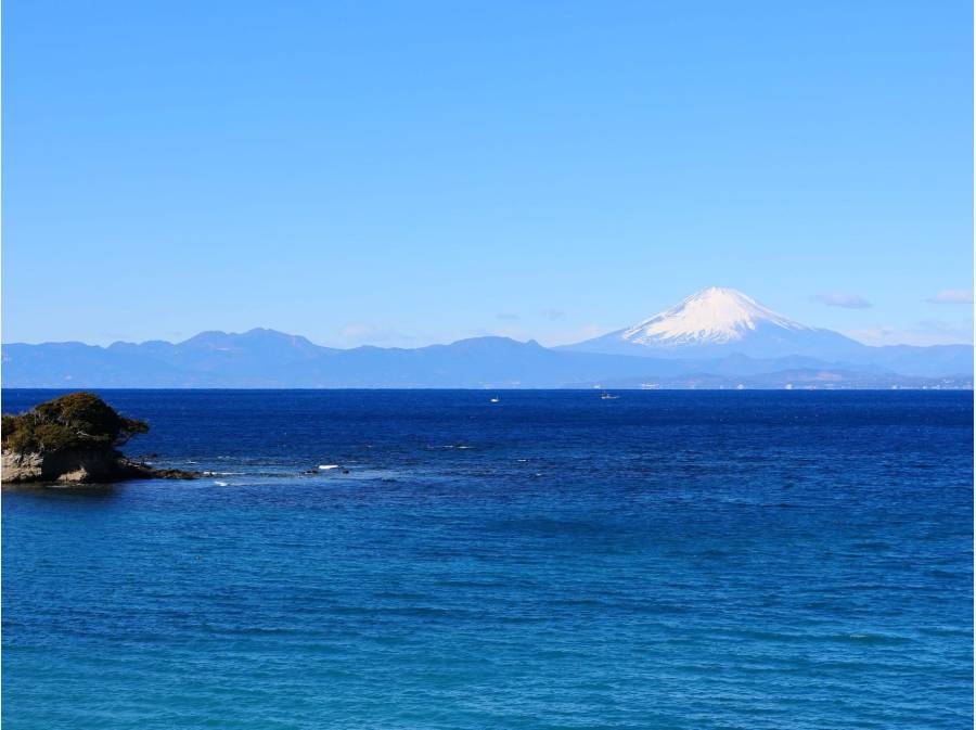 富士山やサンセットと風光明媚な景色が広がり、透明度の高い穏やかな海。